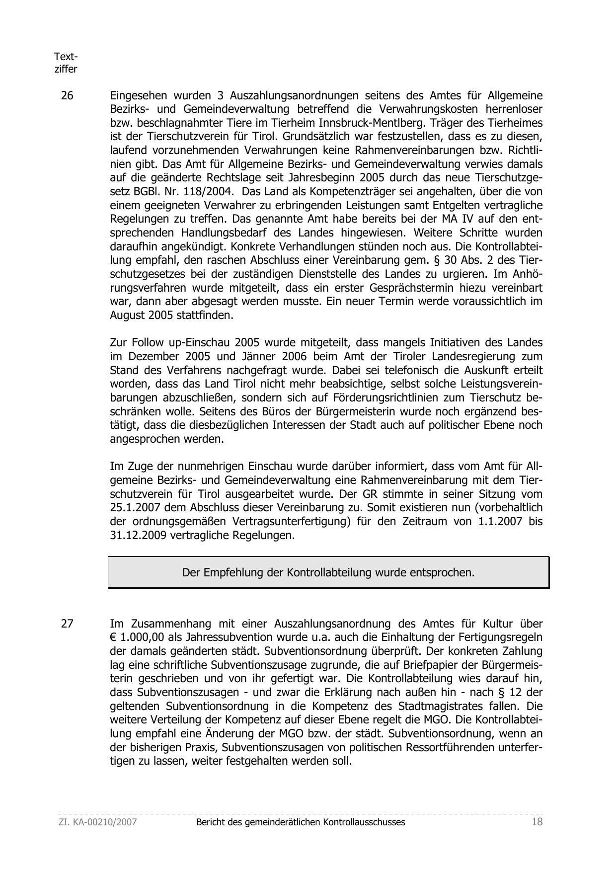 Im Zuge der nunmehrigen Einschau wurde darüber informiert, dass vom Amt für Allgemeine Bezirks- und Gemeindeverwaltung eine Rahmenvereinbarung mit dem Tierschutzverein für Tirol ausgearbeitet wurde. Der GR stimmte in seiner Sitzung vom