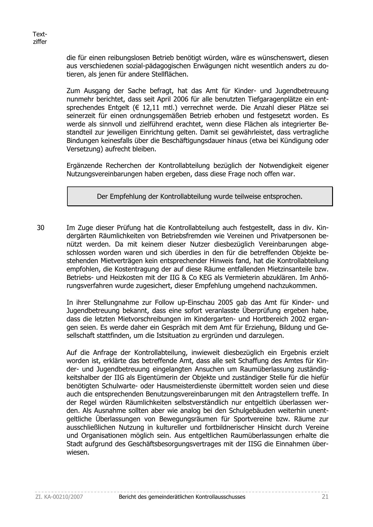 worden ist, erklärte das betreffende Amt, dass alle seit Schaffung des Amtes für Kinder- und Jugendbetreuung eingelangten Ansuchen um Raumüberlassung zuständigkeitshalber der IIG als Eigentümerin der Objekte und zuständiger Stelle für die hiefür
