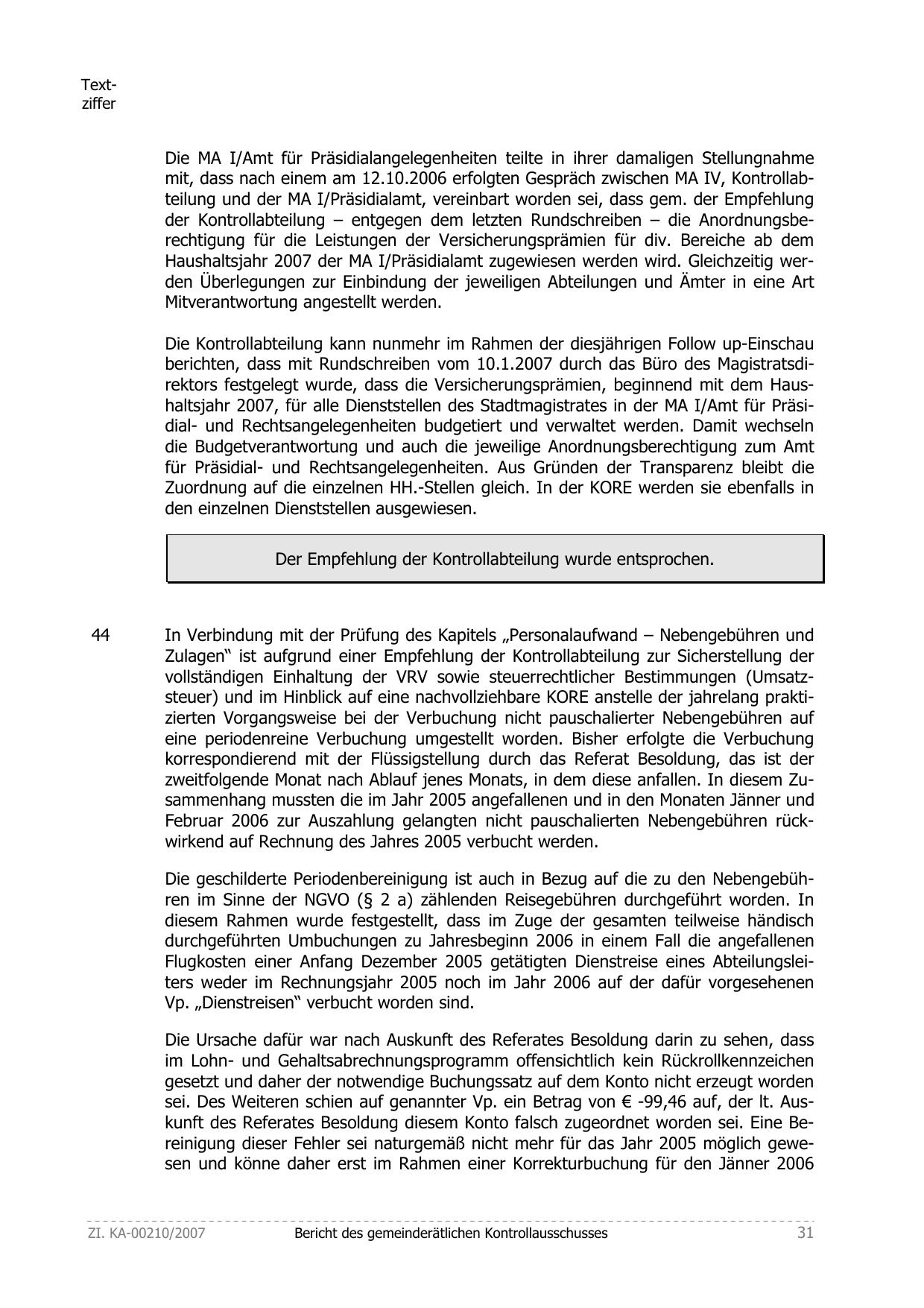 mit, dass nach einem am 12.10.2006 erfolgten Gespräch zwischen MA IV, Kontrollabteilung und der MA I/Präsidialamt, vereinbart worden sei, dass gem. der Empfehlung