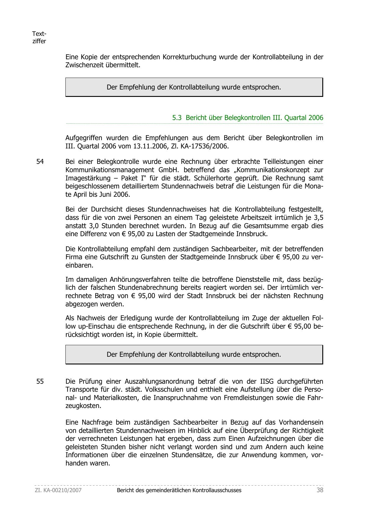Im damaligen Anhörungsverfahren teilte die betroffene Dienststelle mit, dass bezüglich der falschen Stundenabrechnung bereits reagiert worden sei. Der irrtümlich verrechnete Betrag von € 95,00 wird der Stadt Innsbruck bei der nächsten Rechnung