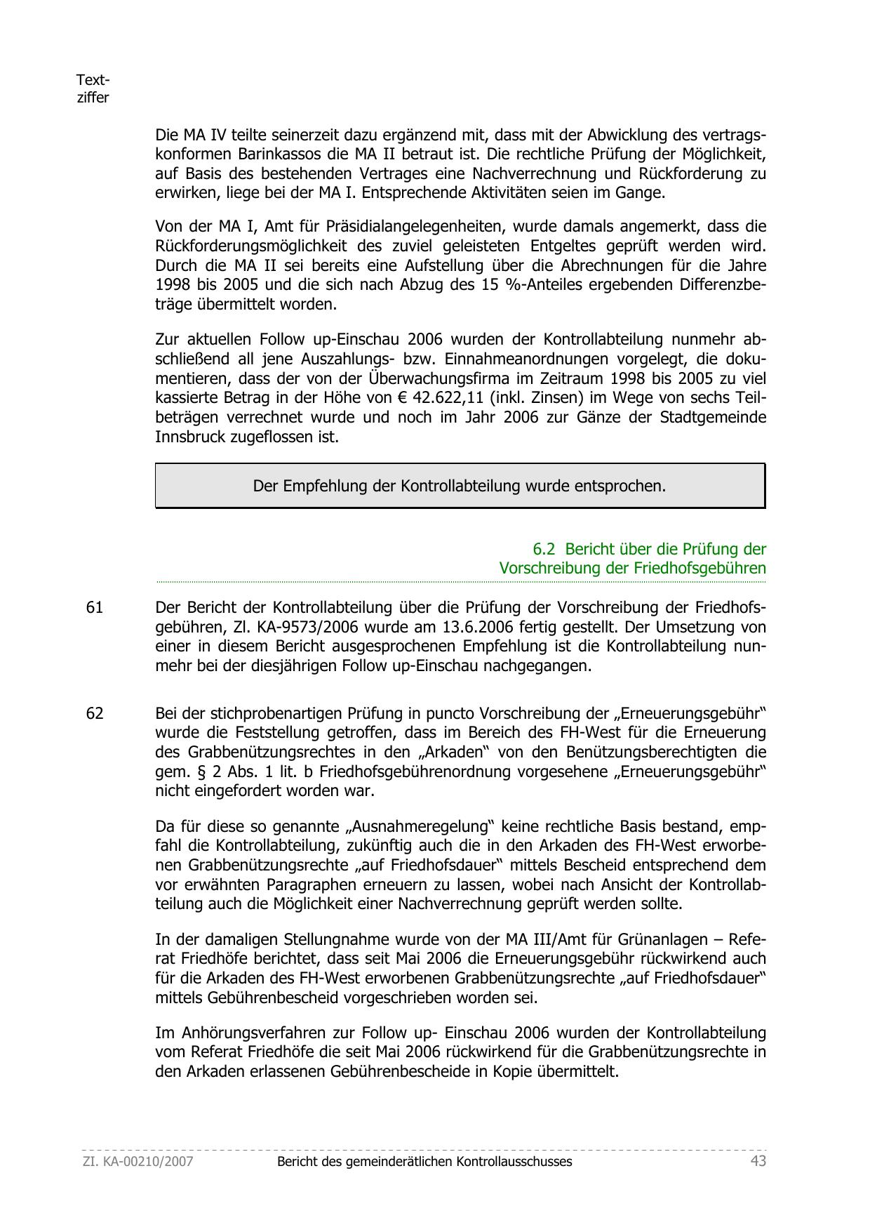 Der Bericht der Kontrollabteilung über die Prüfung der Vorschreibung der Friedhofsgebühren, Zl. KA-9573/2006 wurde am 13.6.2006 fertig gestellt. Der Umsetzung von