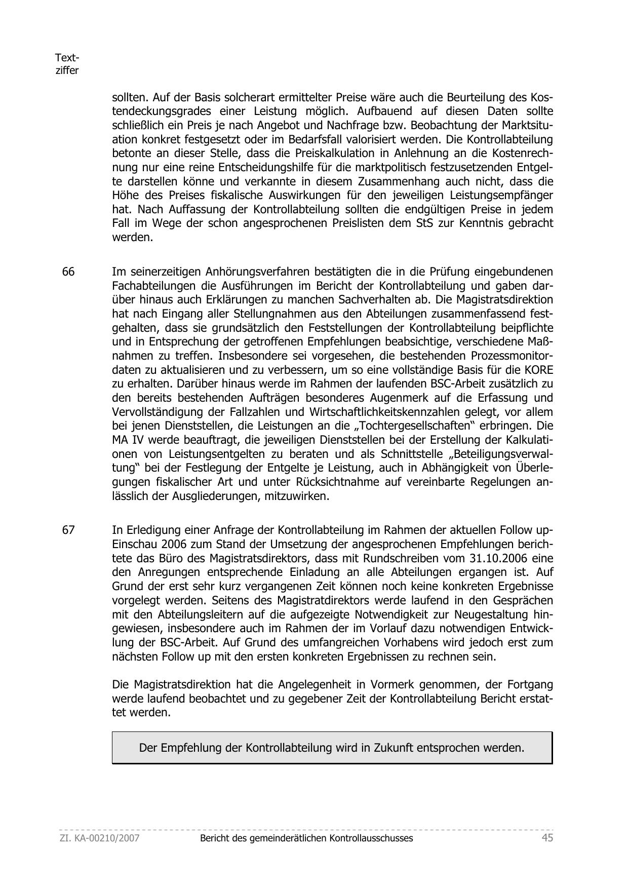 In Erledigung einer Anfrage der Kontrollabteilung im Rahmen der aktuellen Follow upEinschau 2006 zum Stand der Umsetzung der angesprochenen Empfehlungen berichtete das Büro des Magistratsdirektors, dass mit Rundschreiben vom 31.10.2006 eine