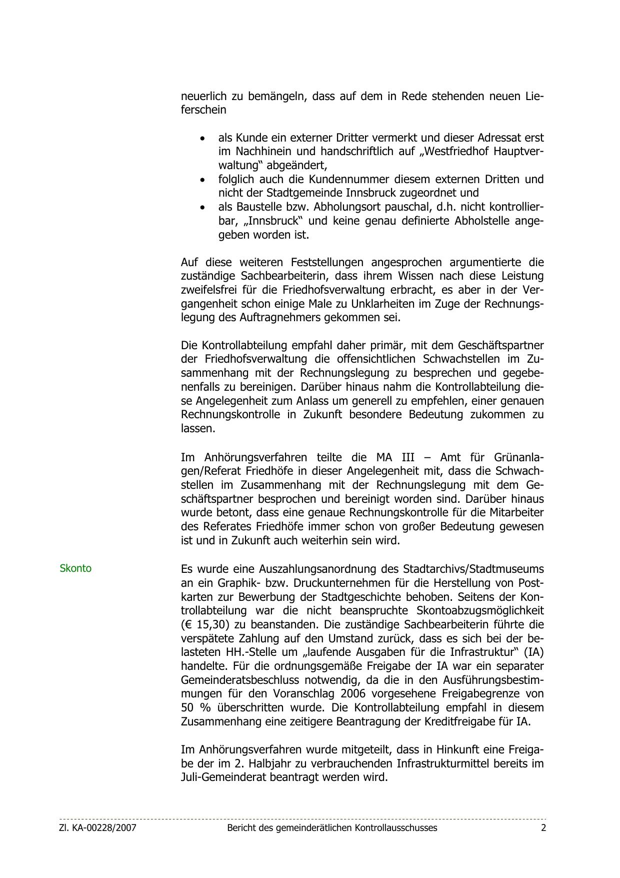der Friedhofsverwaltung die offensichtlichen Schwachstellen im Zusammenhang mit der Rechnungslegung zu besprechen und gegebenenfalls zu bereinigen. Darüber hinaus nahm die Kontrollabteilung diese Angelegenheit zum Anlass um generell zu empfehlen, einer genauen