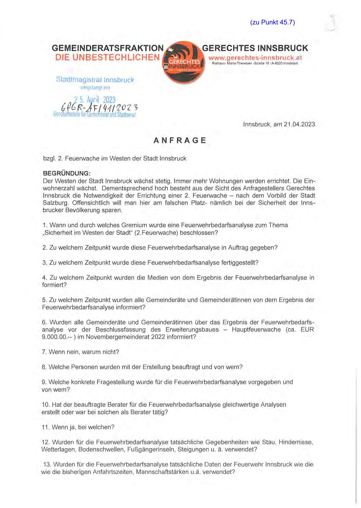 Innsbruck die Notwendigkeit der Errichtung einer 2. Feuerwache - nach dem Vorbild der Stadt