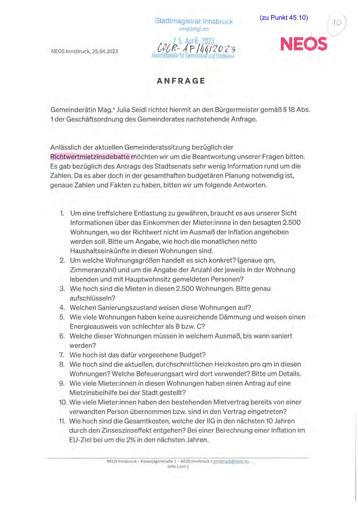 Gemeinderätin Mag.aJulia Seidl richtet hiermit an den Bürgermeister gemäß§ 18 Abs.