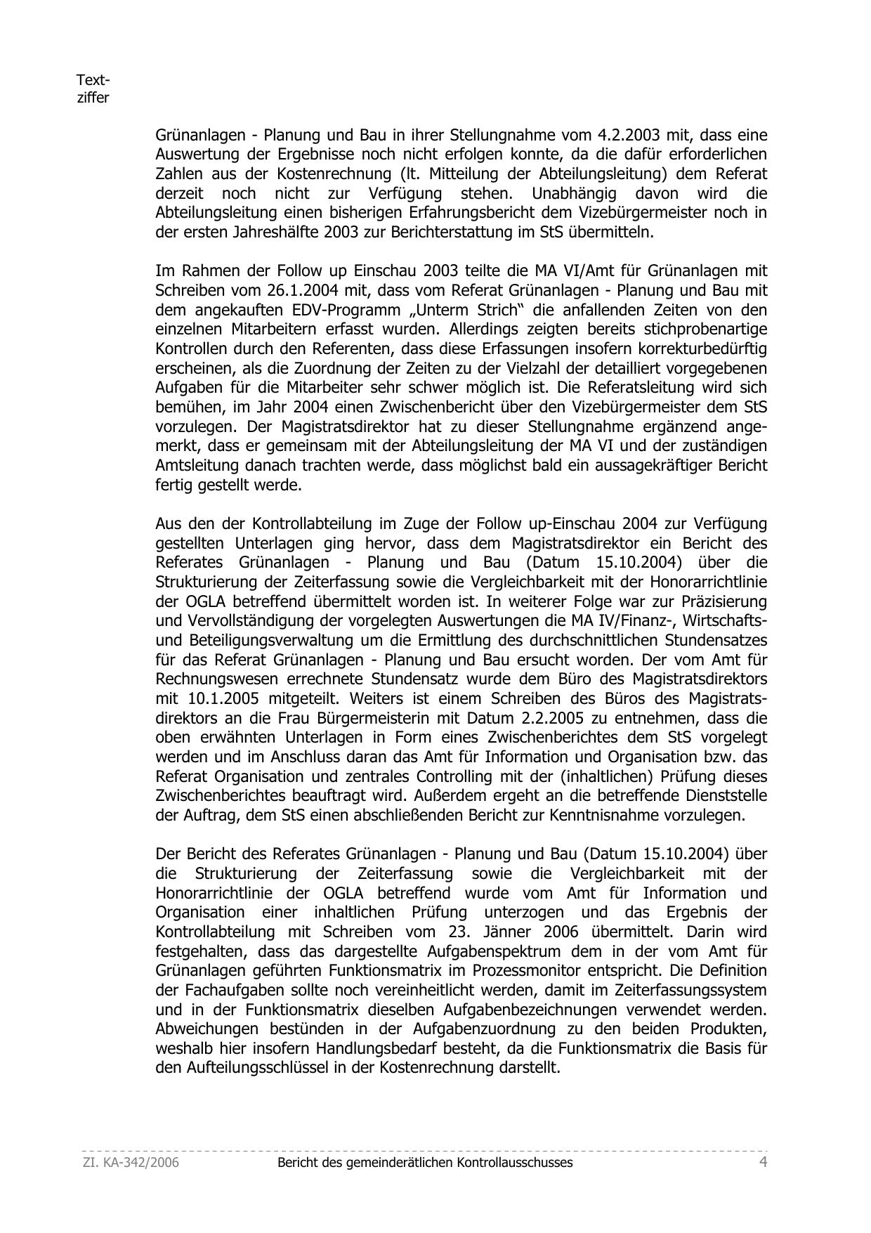 Im Rahmen der Follow up Einschau 2003 teilte die MA VI/Amt für Grünanlagen mit
