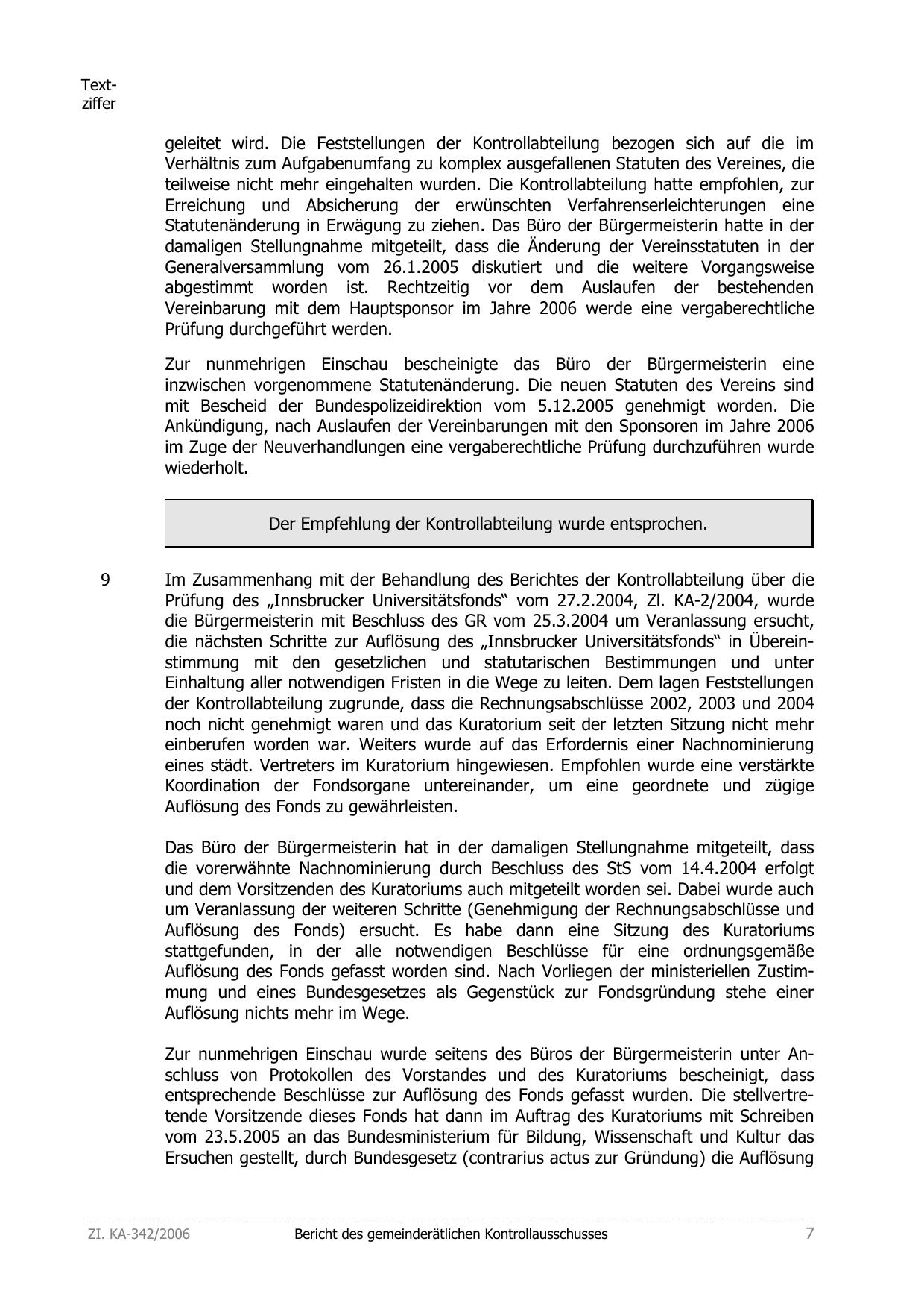 Prüfung des „Innsbrucker Universitätsfonds“ vom 27.2.2004, Zl. KA-2/2004, wurde