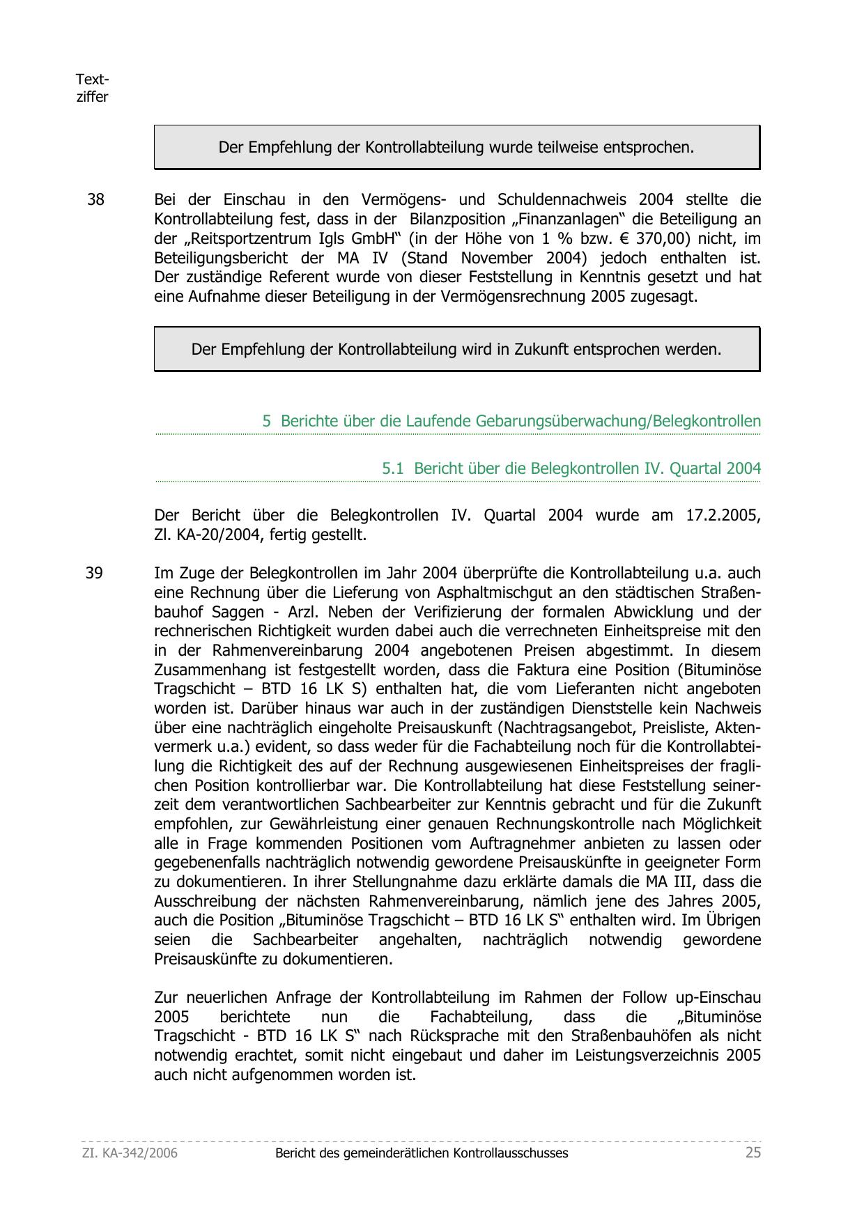 Der Bericht über die Belegkontrollen IV. Quartal 2004 wurde am 17.2.2005,