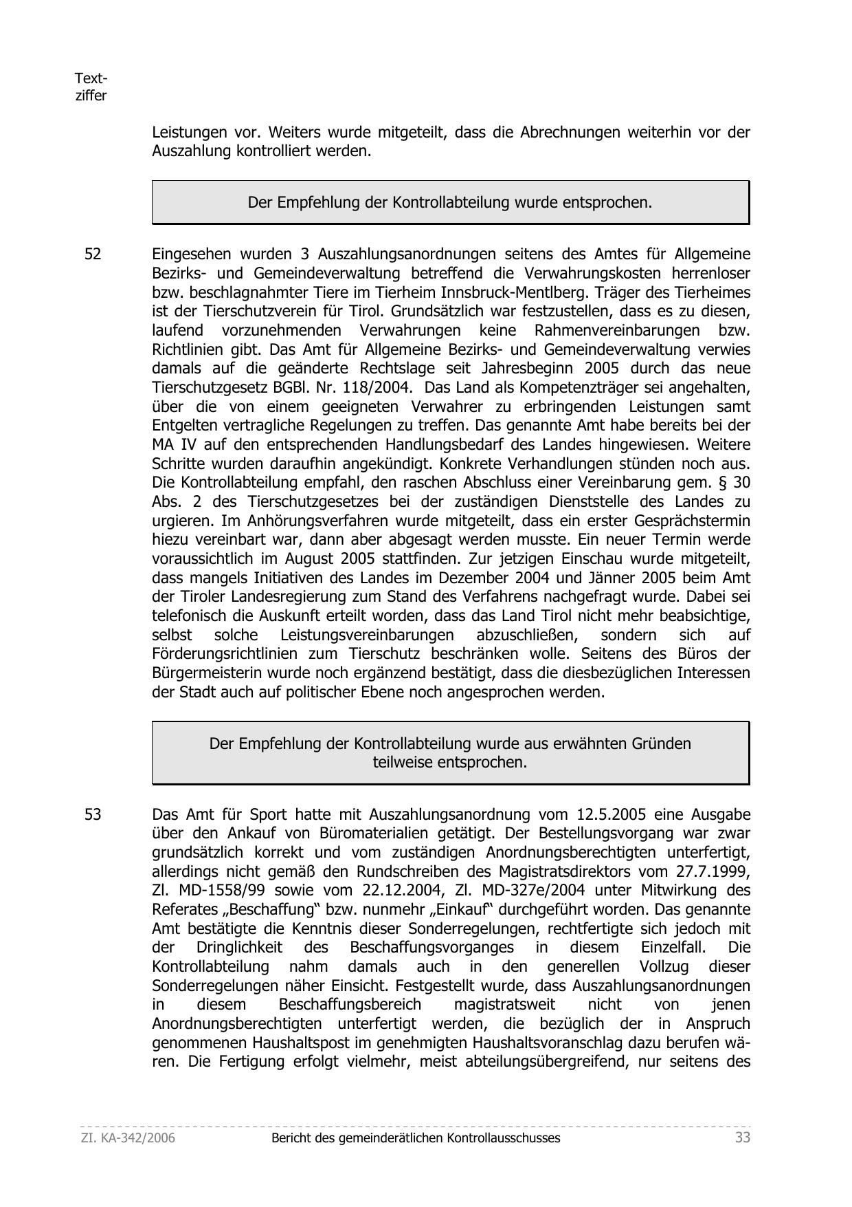 Der Empfehlung der Kontrollabteilung wurde entsprochen.