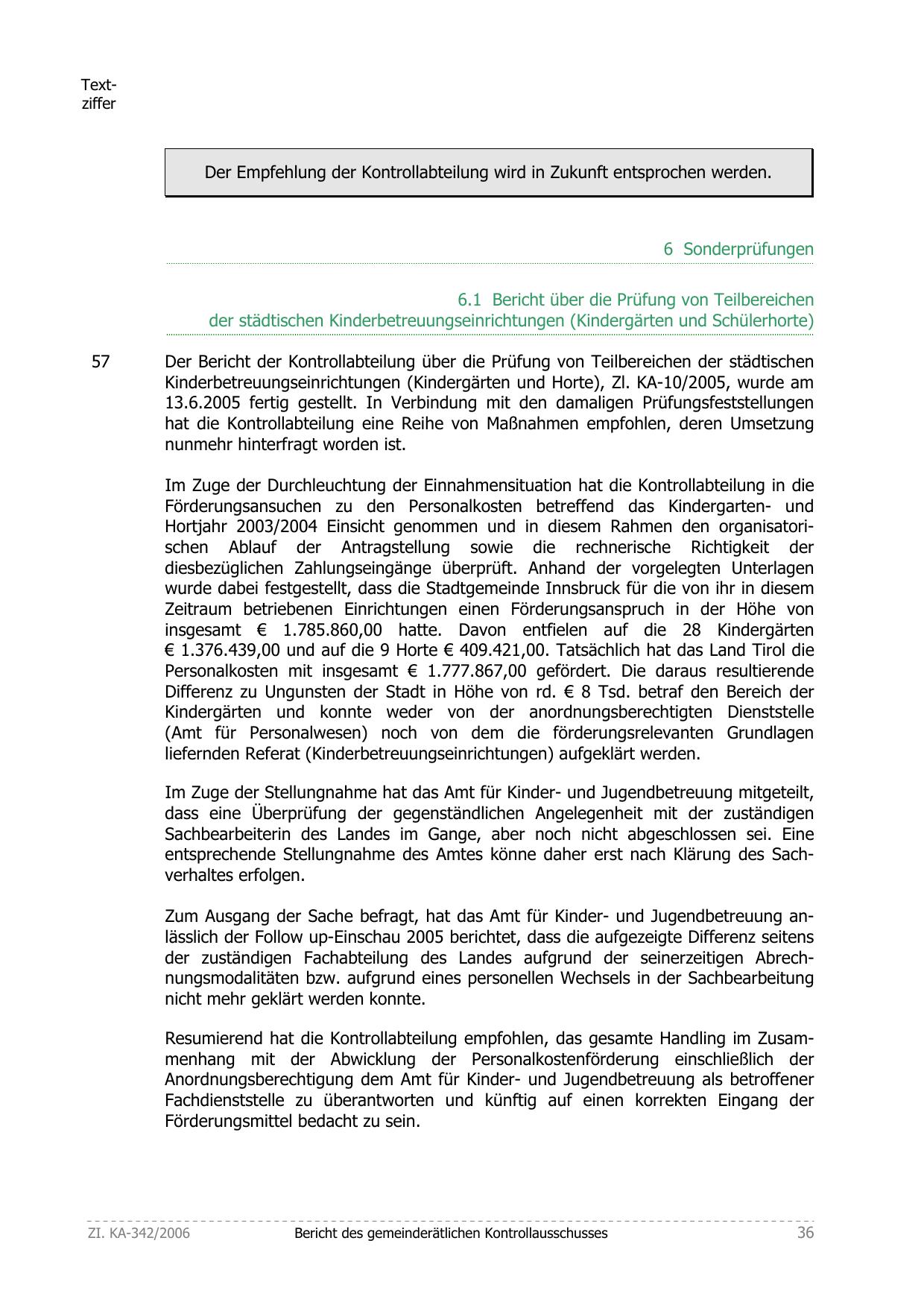 Zum Ausgang der Sache befragt, hat das Amt für Kinder- und Jugendbetreuung anlässlich der Follow up-Einschau 2005 berichtet, dass die aufgezeigte Differenz seitens