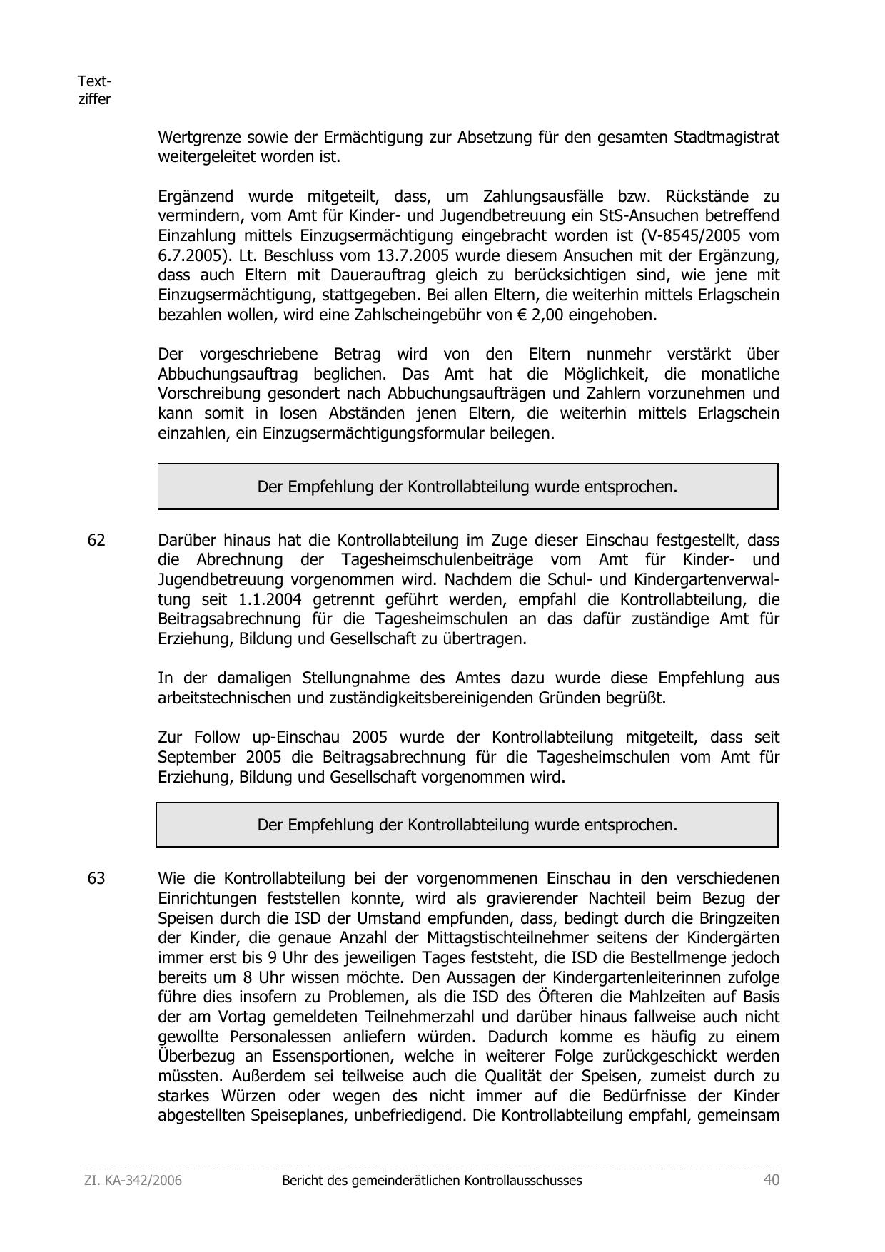 Jugendbetreuung vorgenommen wird. Nachdem die Schul- und Kindergartenverwaltung seit 1.1.2004 getrennt geführt werden, empfahl die Kontrollabteilung, die