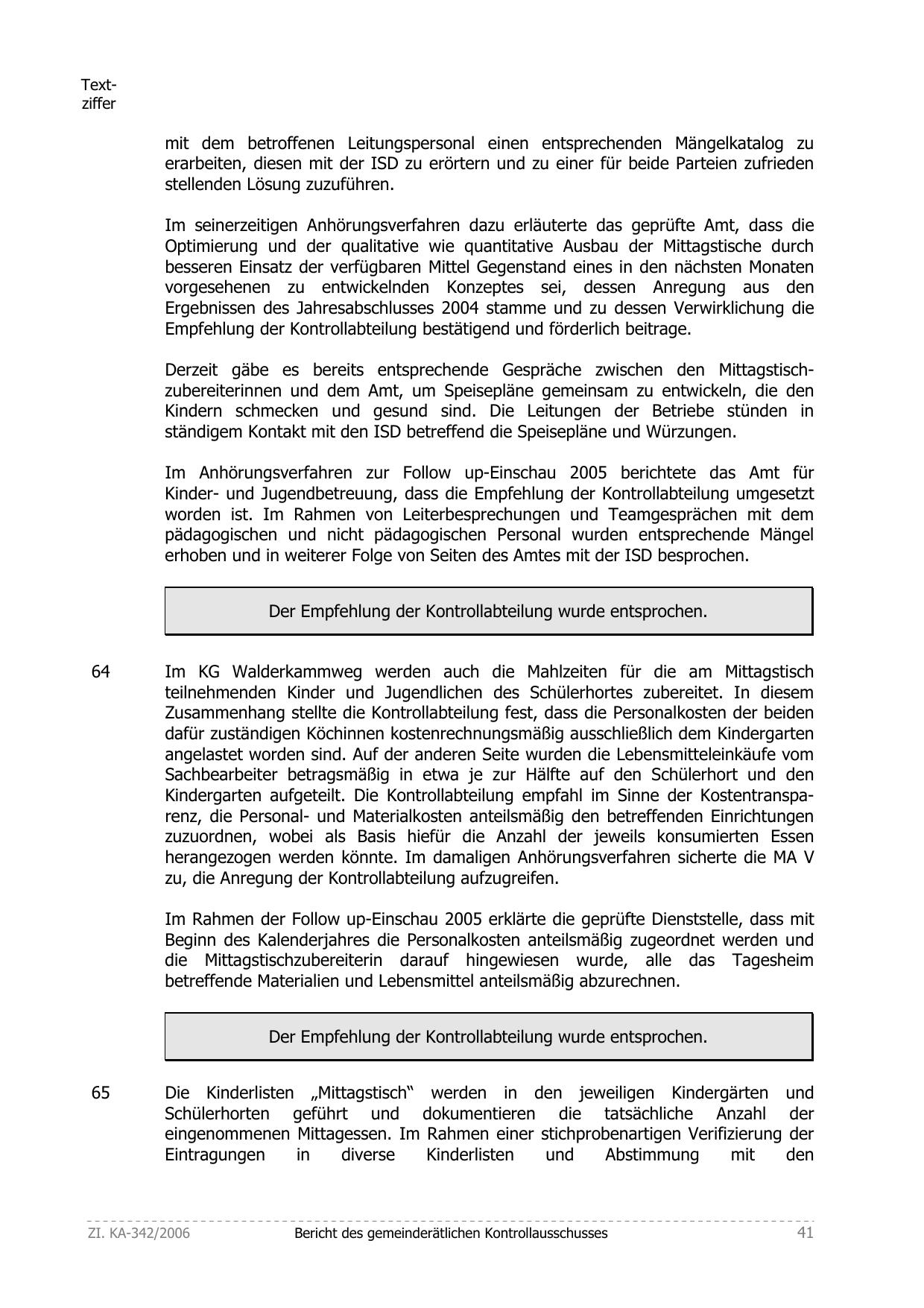 Kinder- und Jugendbetreuung, dass die Empfehlung der Kontrollabteilung umgesetzt