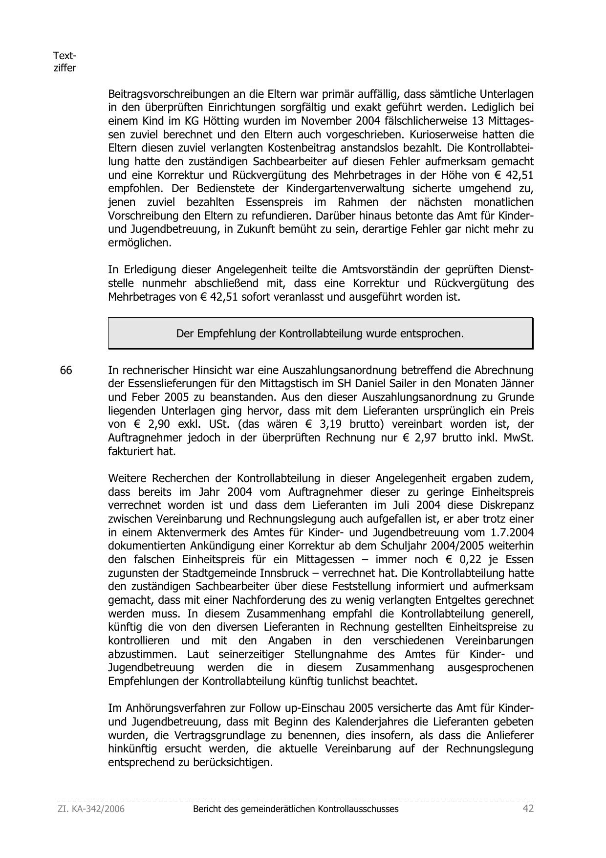 Im Anhörungsverfahren zur Follow up-Einschau 2005 versicherte das Amt für Kinderund Jugendbetreuung, dass mit Beginn des Kalenderjahres die Lieferanten gebeten