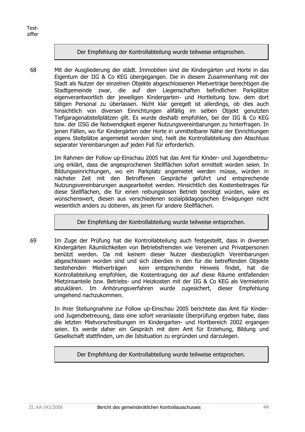 Im Rahmen der Follow up-Einschau 2005 hat das Amt für Kinder- und Jugendbetreuung erklärt, dass die angesprochenen Stellflächen sofort ermittelt worden seien. In