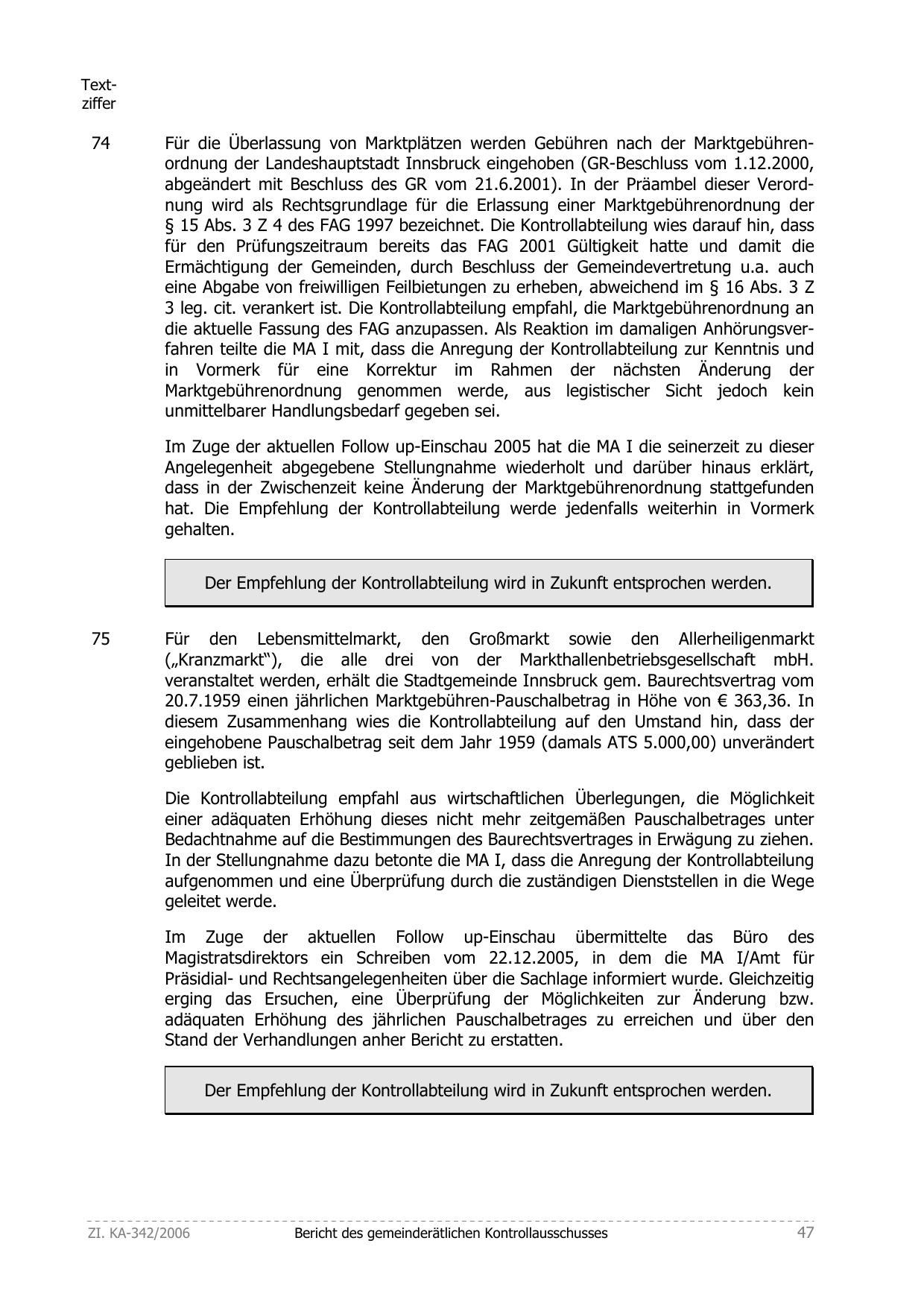 3 leg. cit. verankert ist. Die Kontrollabteilung empfahl, die Marktgebührenordnung an