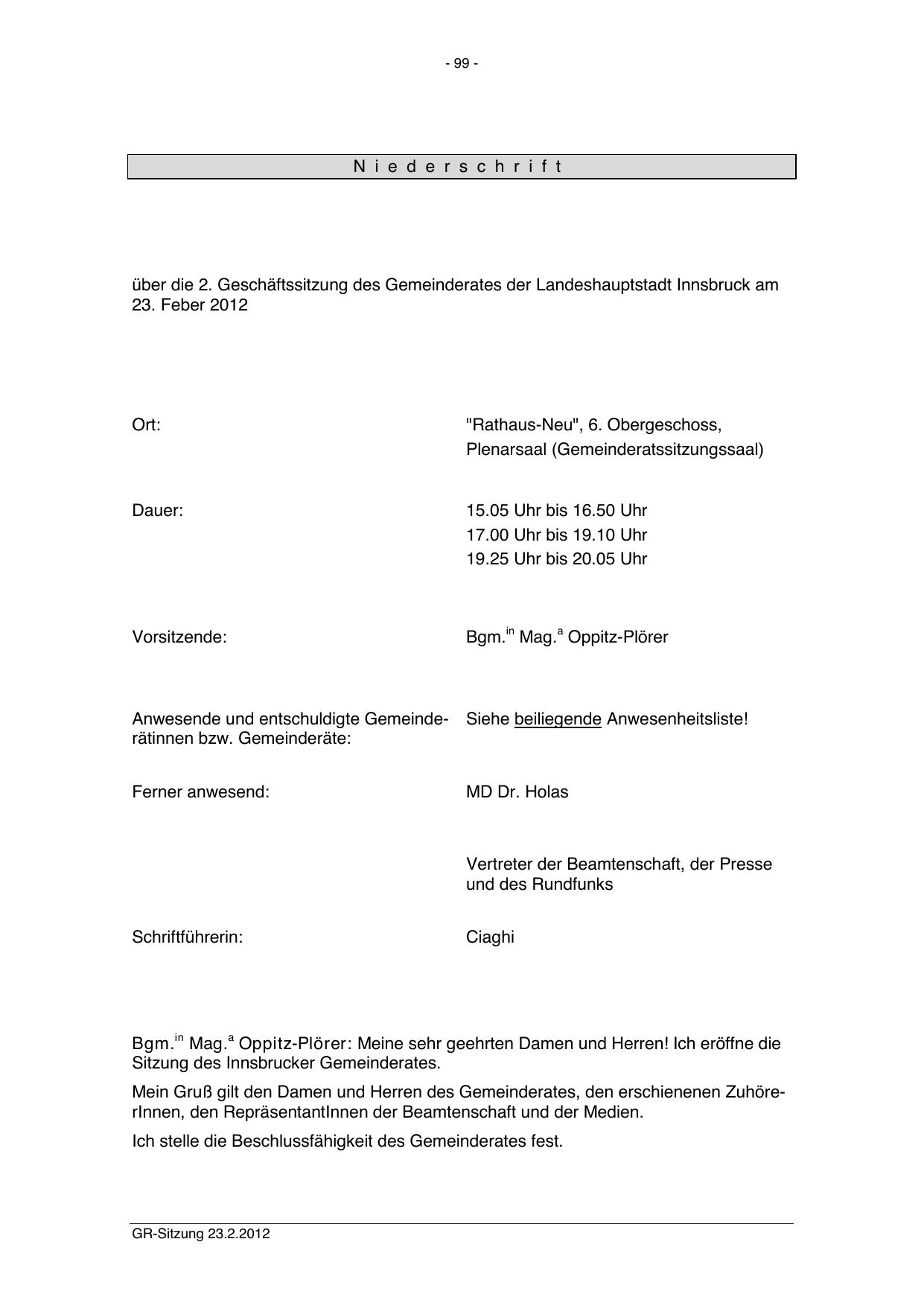 Bgm.in Mag.a Oppitz-Plörer: Meine sehr geehrten Damen und Herren! Ich eröffne die