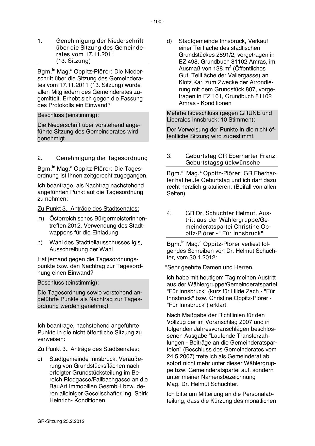 Bgm.in Mag.a Oppitz-Plörer verliest folgendes Schreiben von Dr. Helmut Schuchter, vom 30.1.2012: