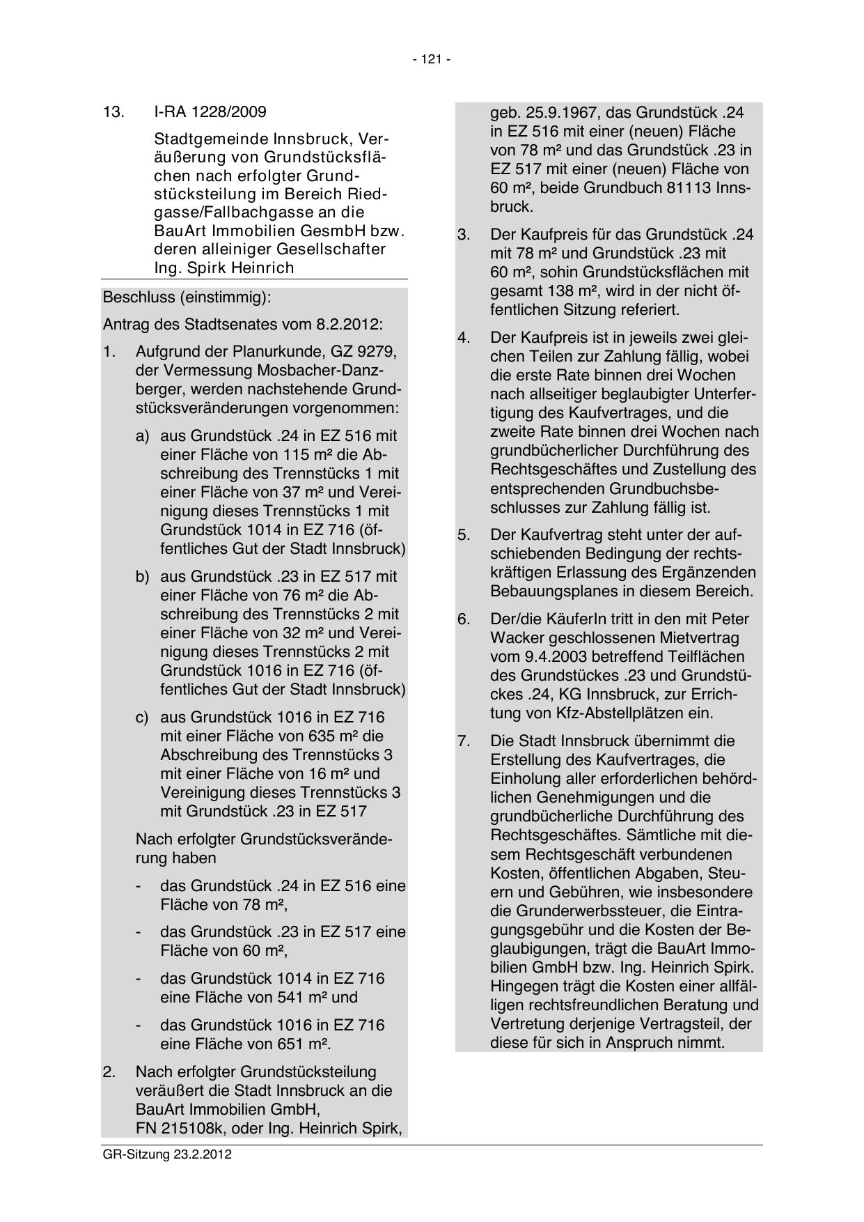Stadtgemeinde Innsbruck, Veräußerung von Grundstücksflächen nach erfolgter Grundstücksteilung im Bereich Riedgasse/Fallbachgasse an die