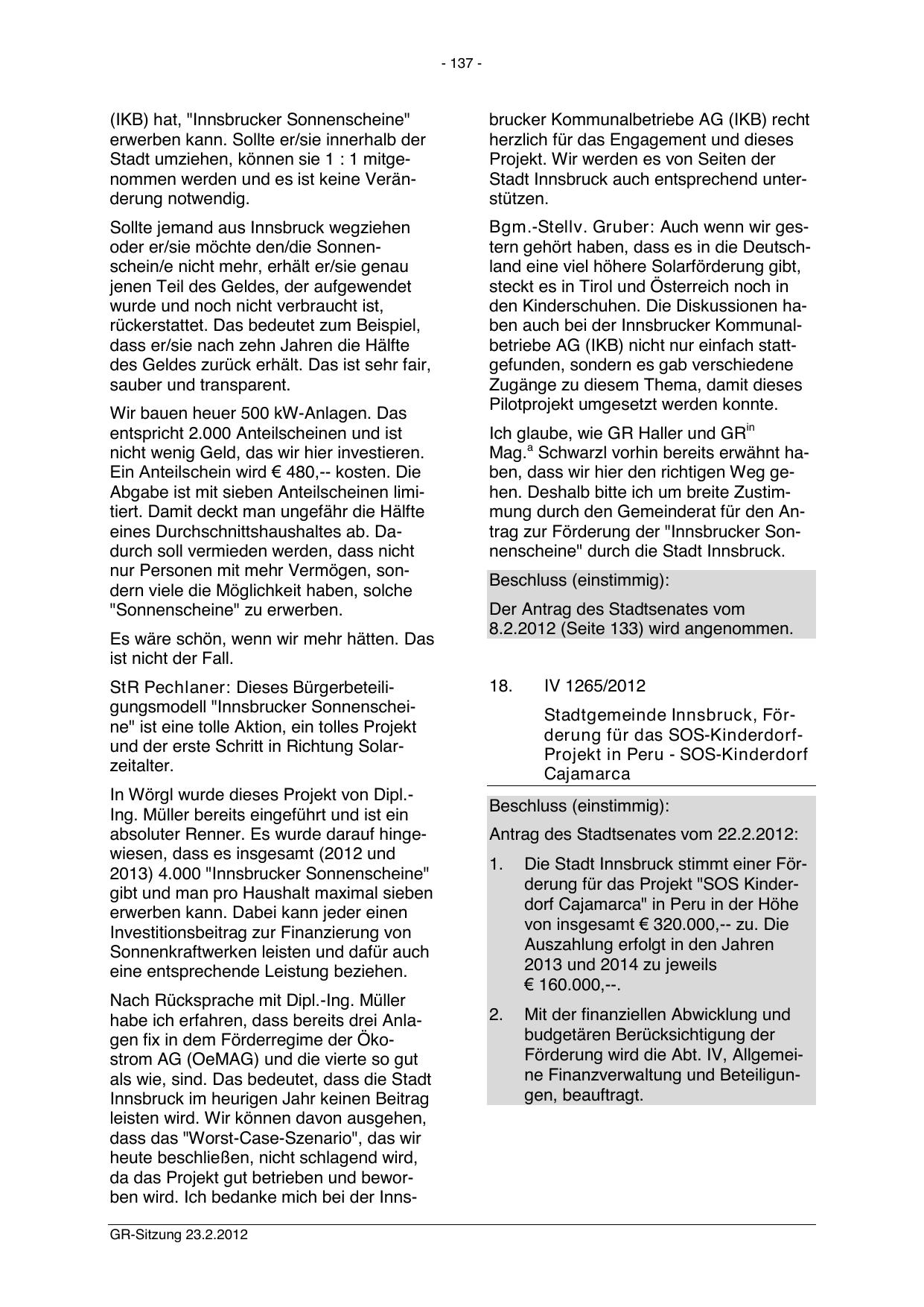 Mag.a Schwarzl vorhin bereits erwähnt haben, dass wir hier den richtigen Weg gehen. Deshalb bitte ich um breite Zustimmung durch den Gemeinderat für den Antrag zur Förderung der "Innsbrucker Sonnenscheine" durch die Stadt Innsbruck.