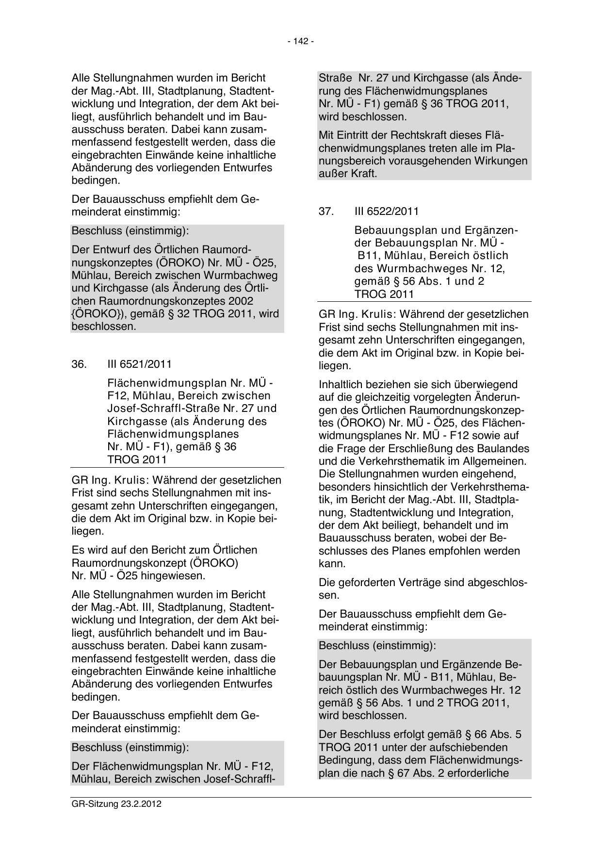 Mühlau, Bereich zwischen Josef-SchrafflGR-Sitzung 23.2.2012