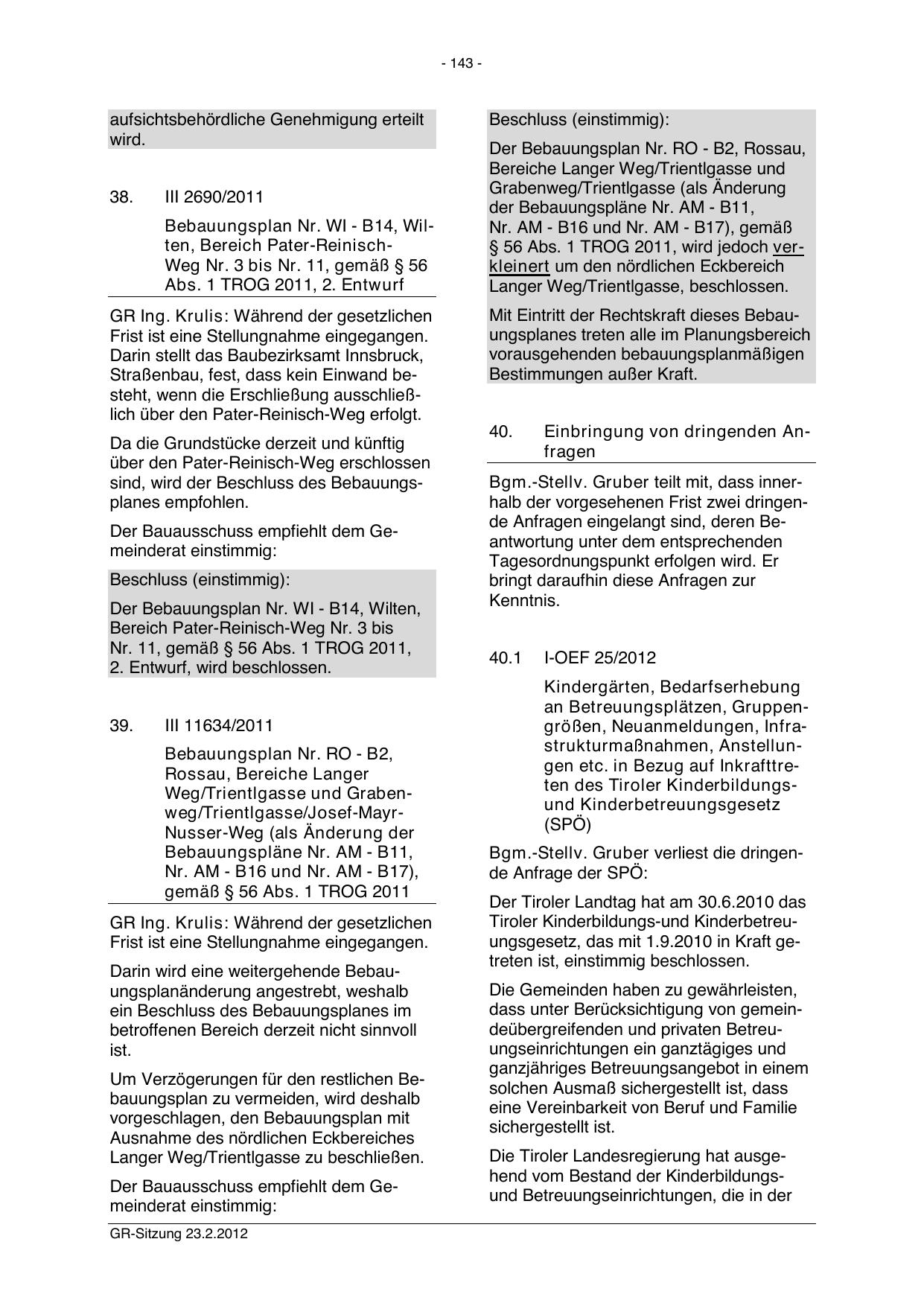 Bebauungsplan Nr. WI - B14, Wilten, Bereich Pater-ReinischWeg Nr. 3 bis Nr. 11, gemäß § 56