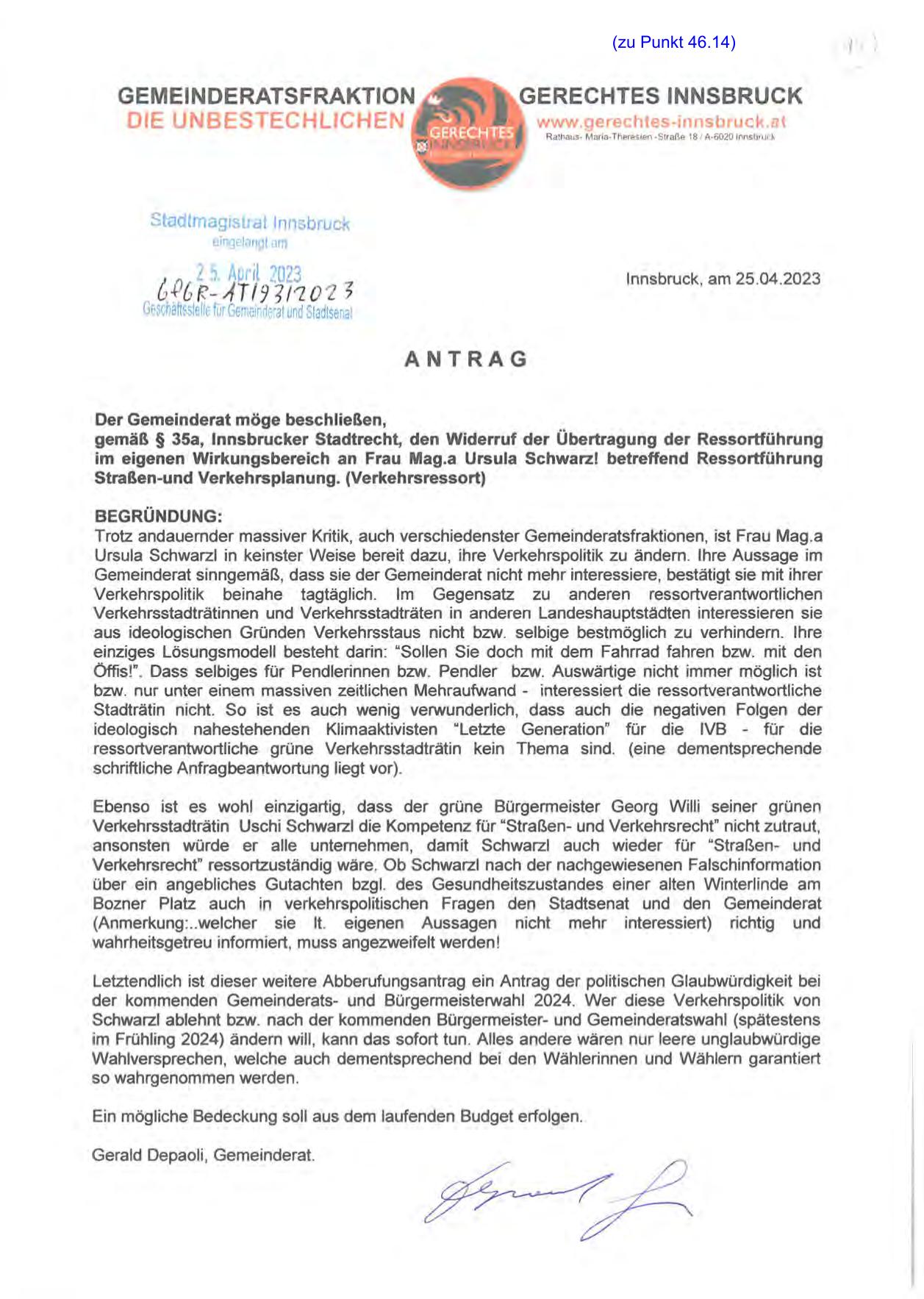 gemäß § 35a, lnnsbrucker Stadtrecht, den Widerruf der Übertragung der Ressortführung