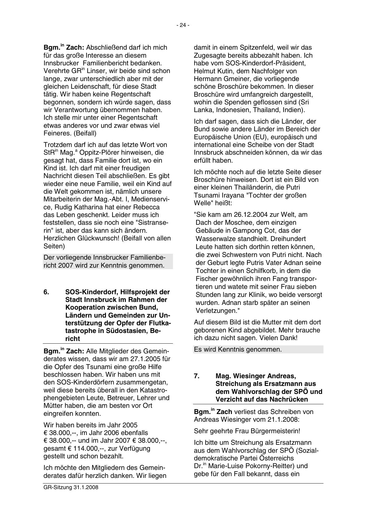 Bgm.in Zach: Alle Mitglieder des Gemeinderates wissen, dass wir am 27.1.2005 für