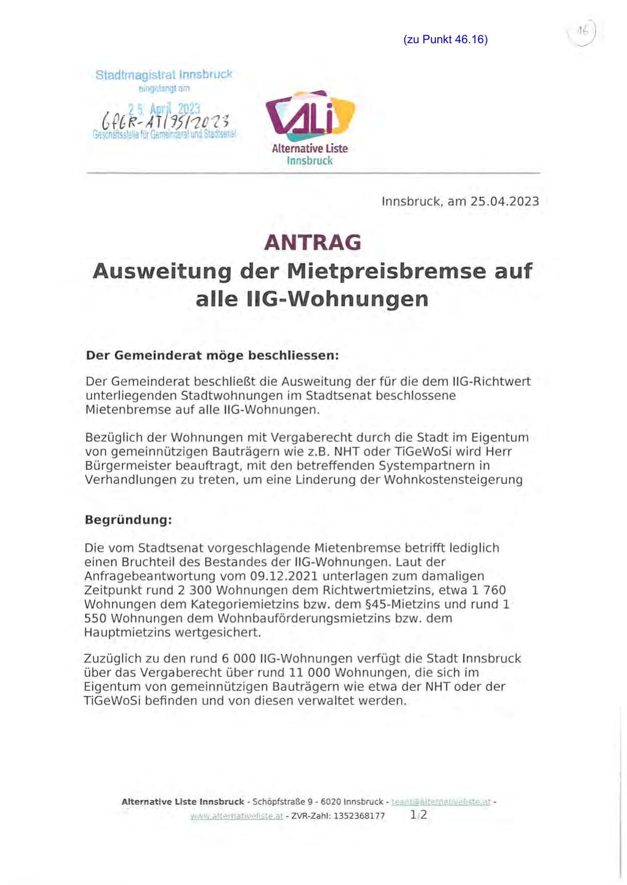 Alternative Liste Innsbru ck• Schöpfst raße 9 • 6020 In nsbruck• team@alternativeliste.at -