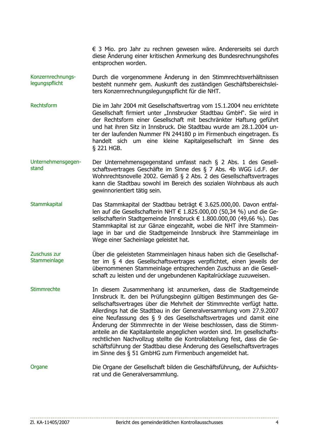 Stammkapital ist zur Gänze eingezahlt, wobei die NHT ihre Stammeinlage in bar und die Stadtgemeinde Innsbruck ihre Stammeinlage im