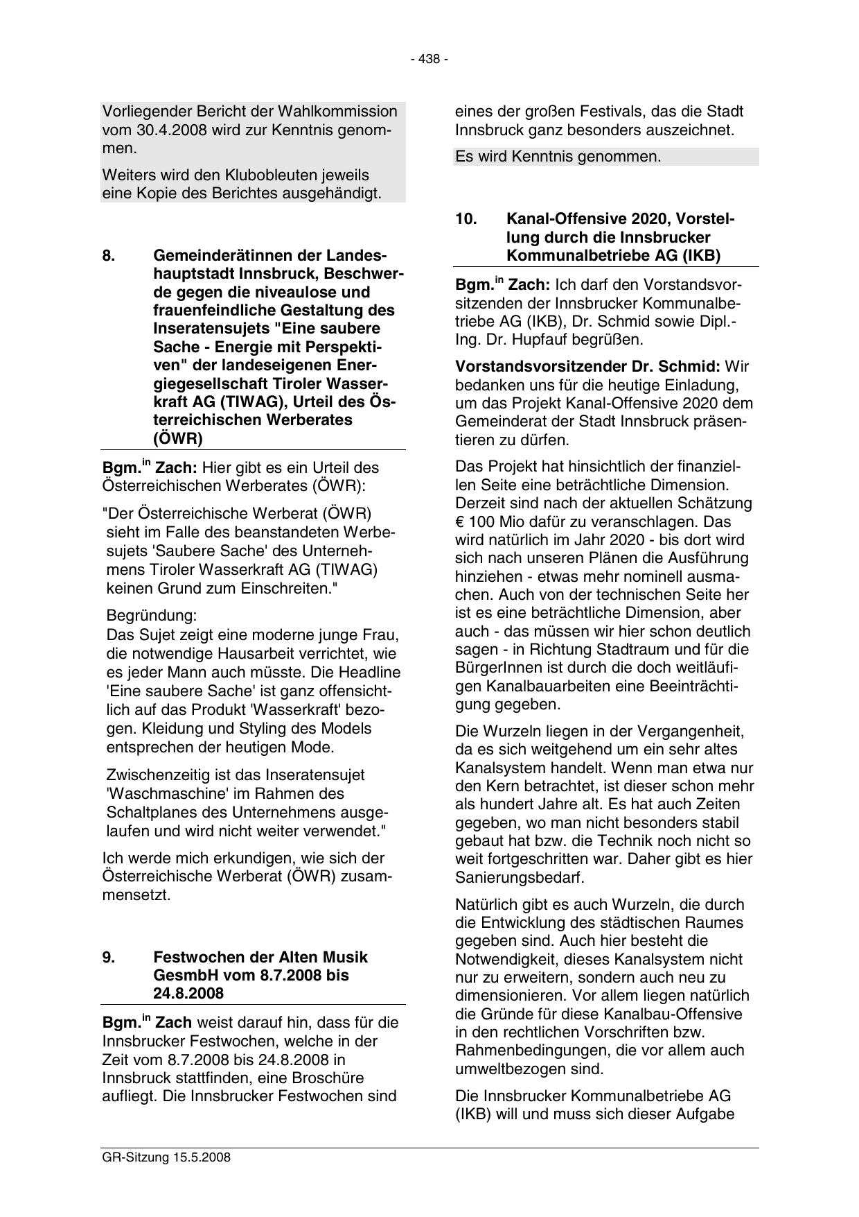 Bgm.in Zach: Ich darf den Vorstandsvorsitzenden der Innsbrucker Kommunalbetriebe AG (IKB), Dr. Schmid sowie Dipl.Ing. Dr. Hupfauf begrüßen.