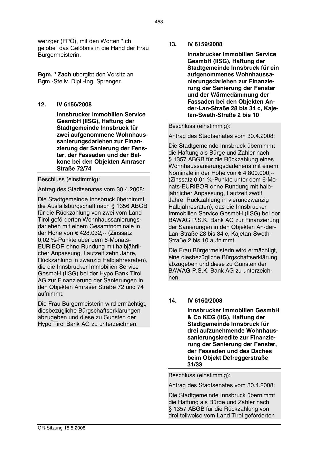 zwei aufgenommene Wohnhaussanierungsdarlehen zur Finanzierung der Sanierung der Fenster, der Fassaden und der Balkone bei den Objekten Amraser