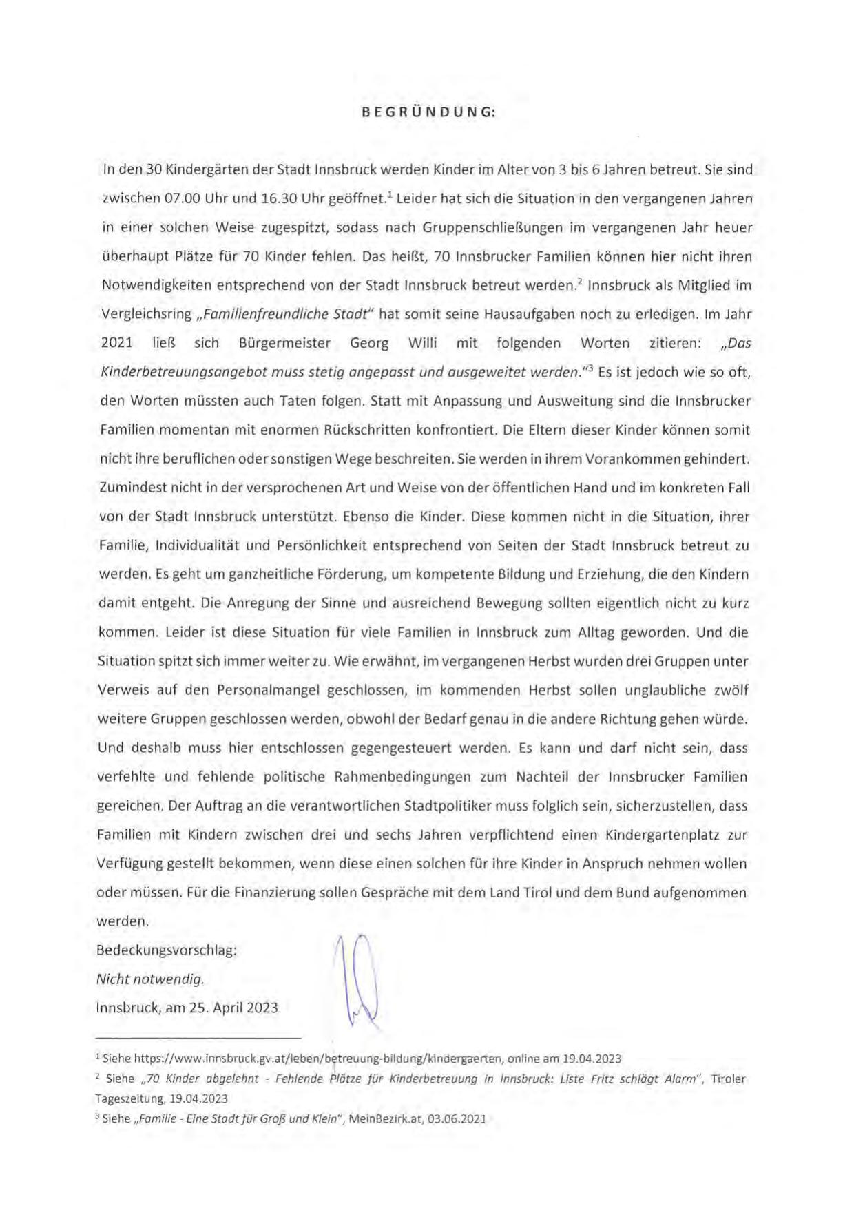 überhaupt Plätze für 70 Kinder fehlen. Das heißt, 70 lnnsbrucker Familien können hier nicht ihren