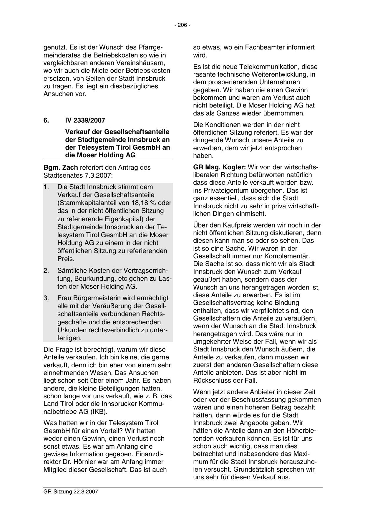 Stadtgemeinde Innsbruck an der Telesystem Tirol GesmbH an die Moser