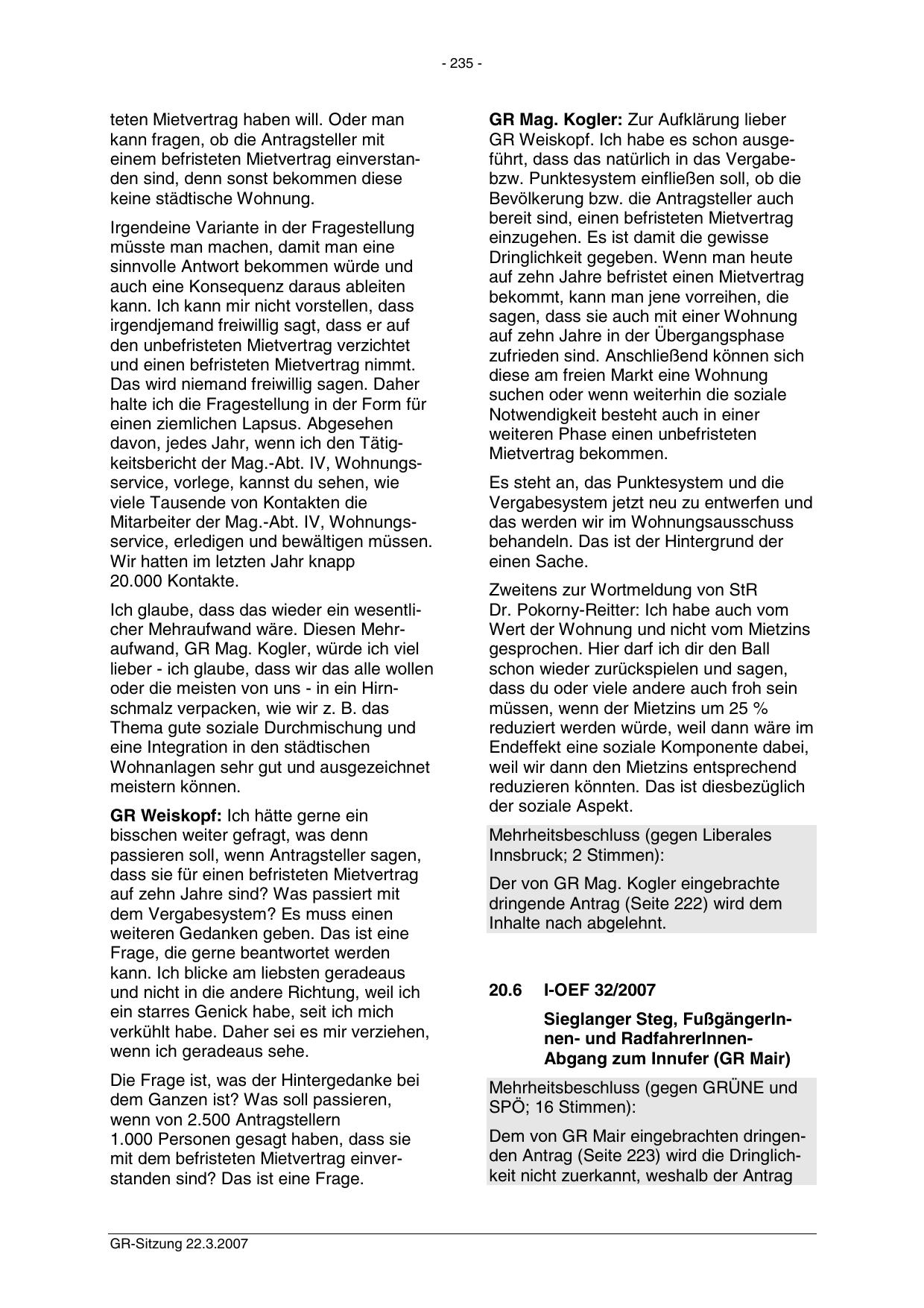 Dem von GR Mair eingebrachten dringenden Antrag (Seite 223) wird die Dringlichkeit nicht zuerkannt, weshalb der Antrag