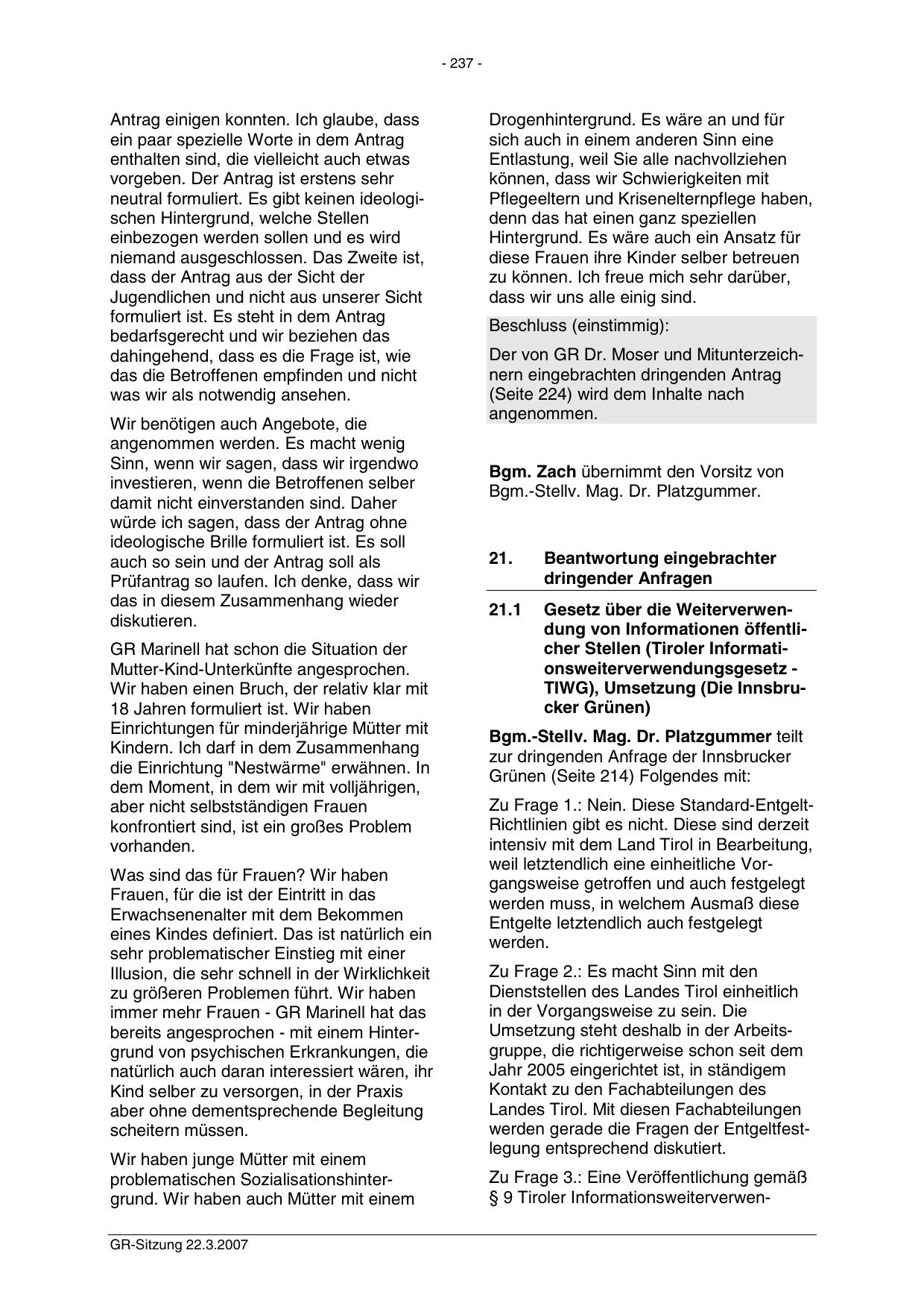 Der von GR Dr. Moser und Mitunterzeichnern eingebrachten dringenden Antrag