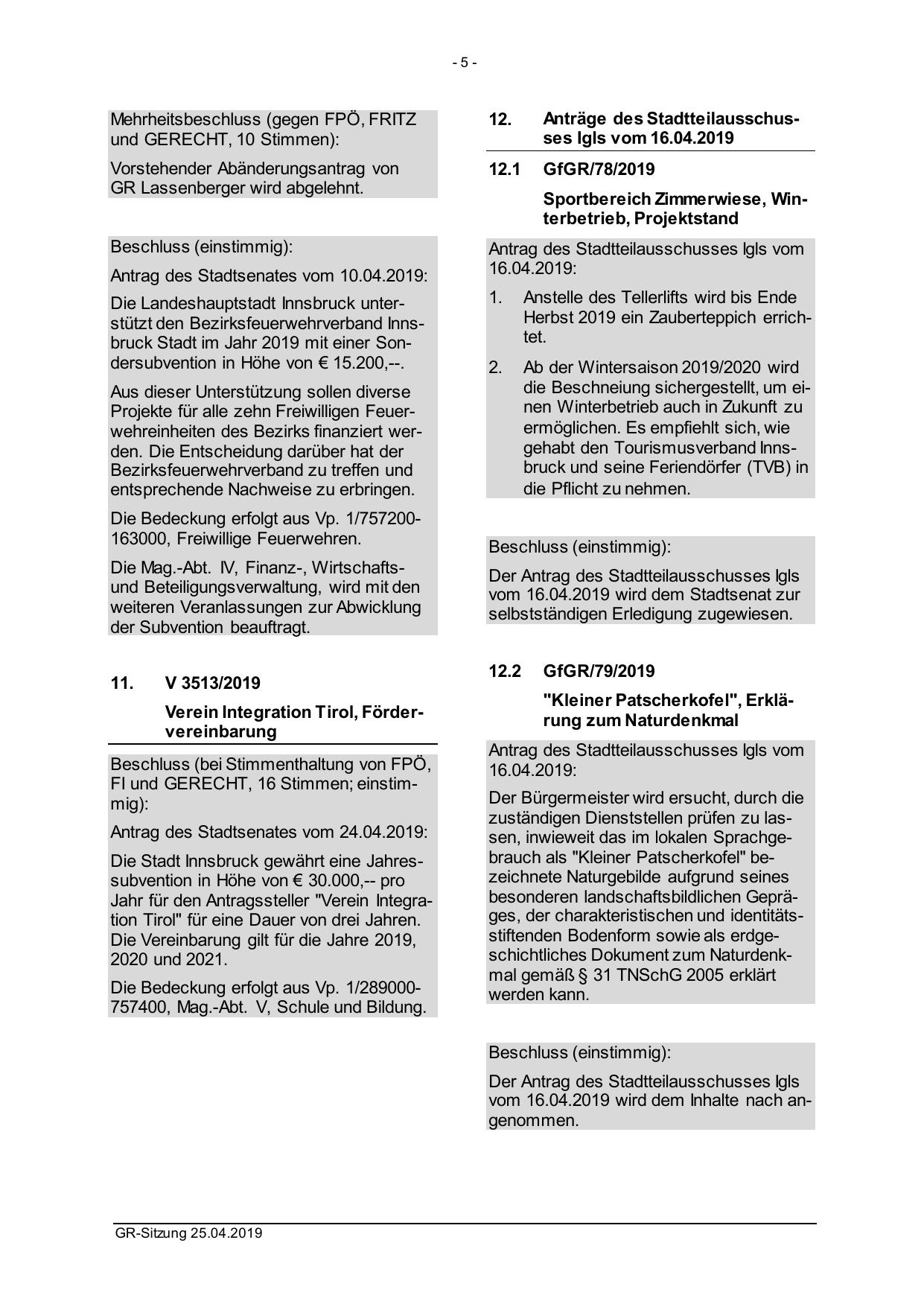 Anträge des Stadtteilausschusses Igls vom 16.04.2019