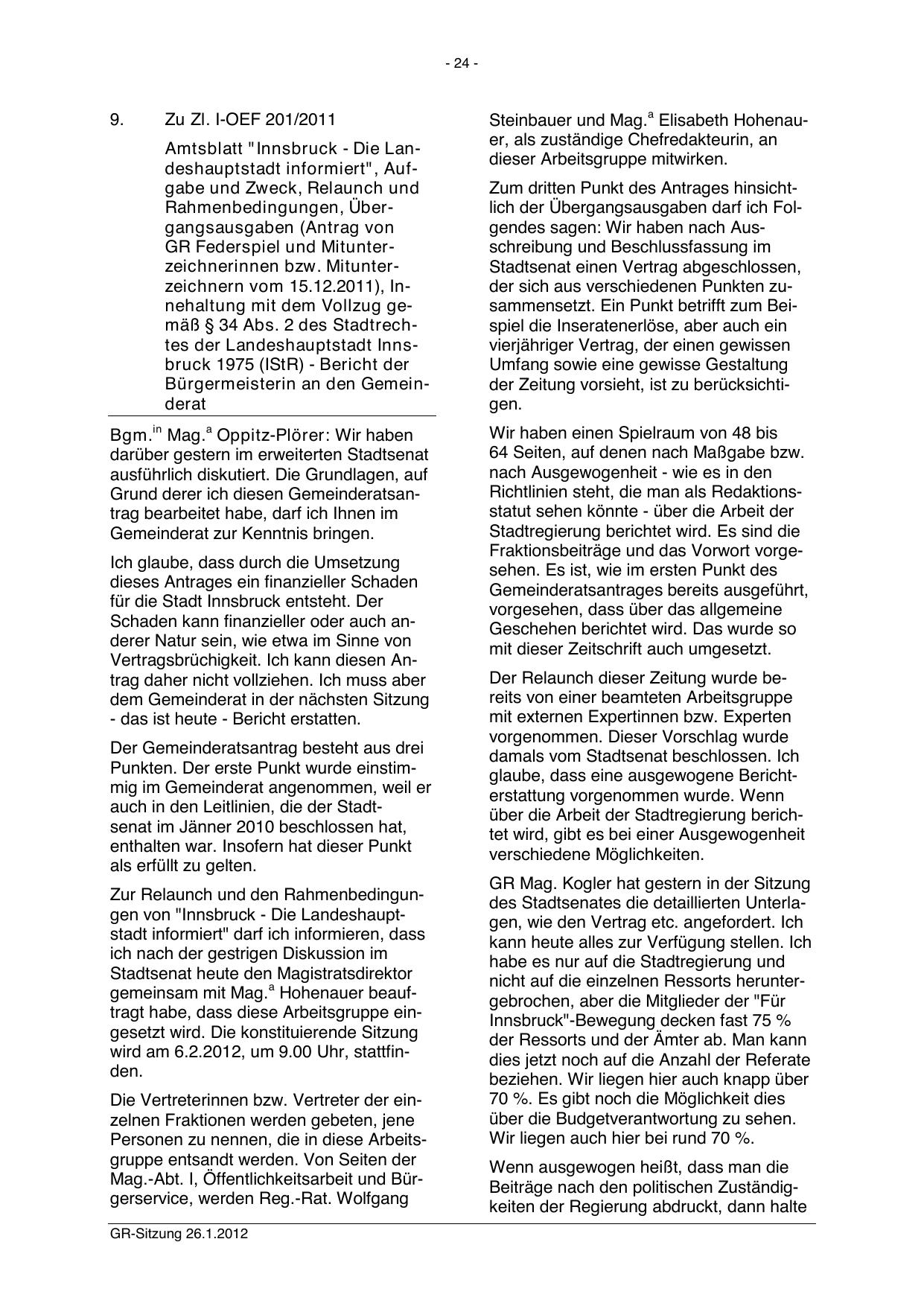 GR Federspiel und Mitunterzeichnerinnen bzw. Mitunterzeichnern vom 15.12.2011), Innehaltung mit dem Vollzug gemäß § 34 Abs. 2 des Stadtrechtes der Landeshauptstadt Innsbruck 1975 (IStR) - Bericht der
