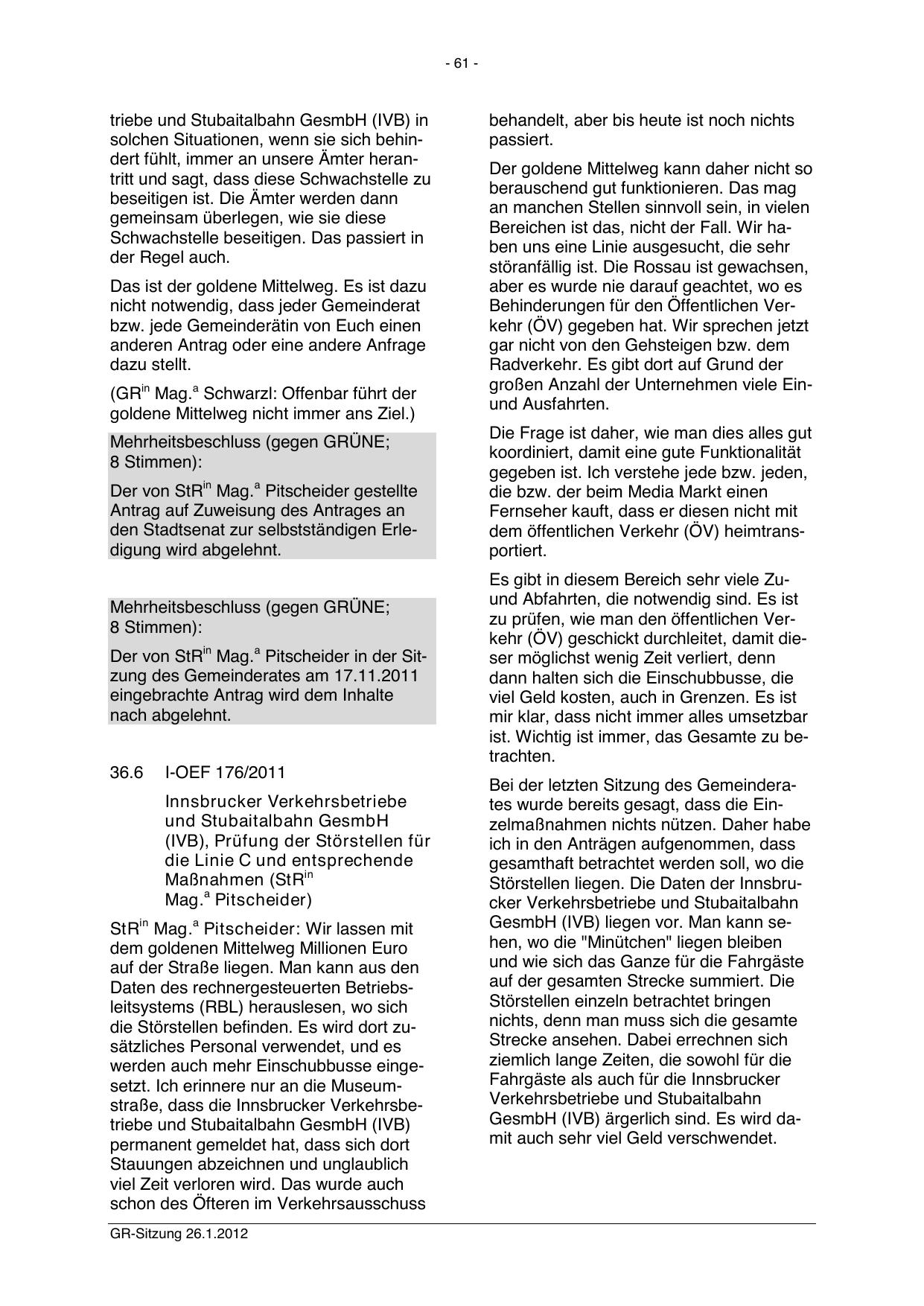 Der von StRin Mag.a Pitscheider in der Sitzung des Gemeinderates am 17.11.2011