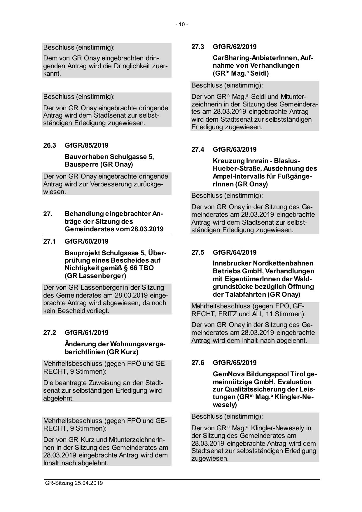 Mehrheitsbeschluss (gegen FPÖ und GERECHT, 9 Stimmen):