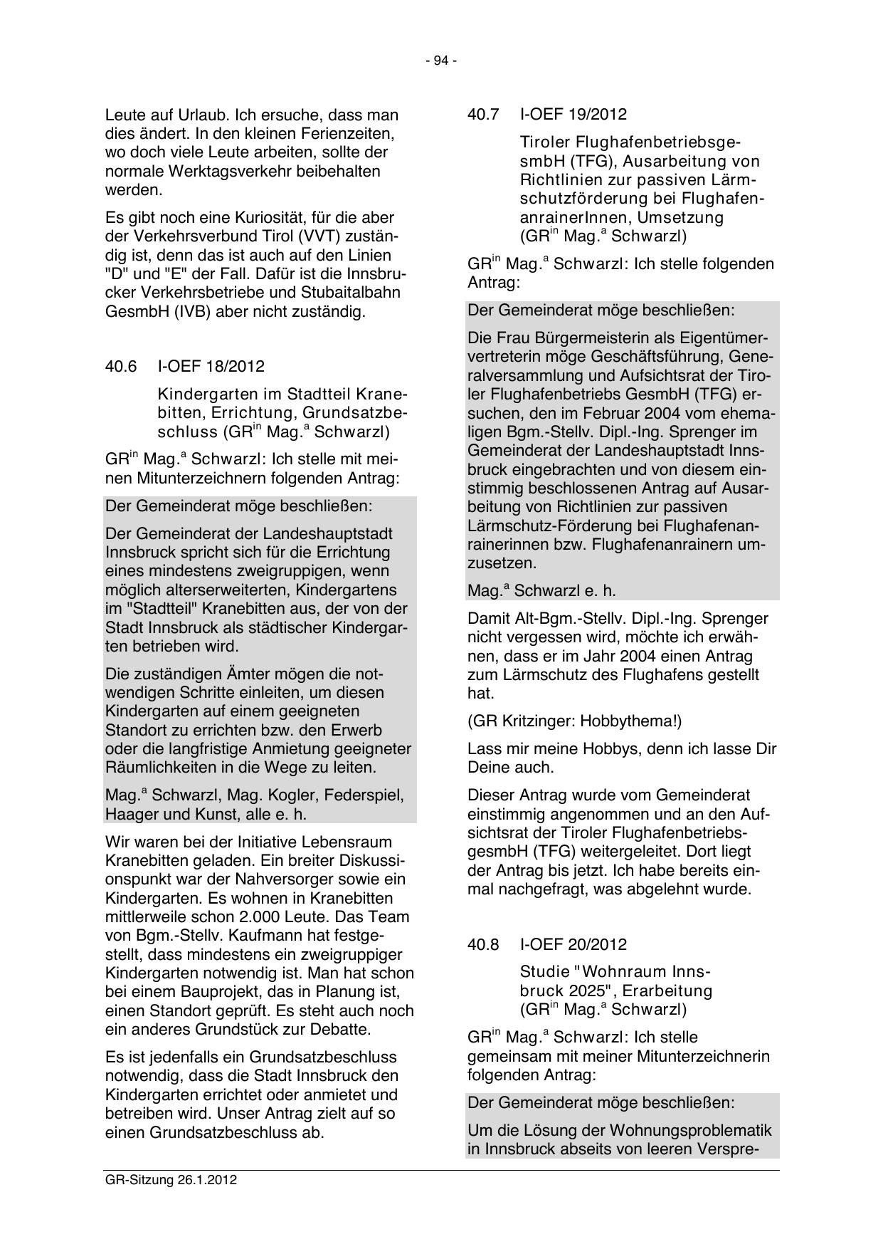 Die Frau Bürgermeisterin als Eigentümervertreterin möge Geschäftsführung, Generalversammlung und Aufsichtsrat der Tiroler Flughafenbetriebs GesmbH (TFG) ersuchen, den im Februar 2004 vom ehemaligen Bgm.-Stellv. Dipl.-Ing. Sprenger im