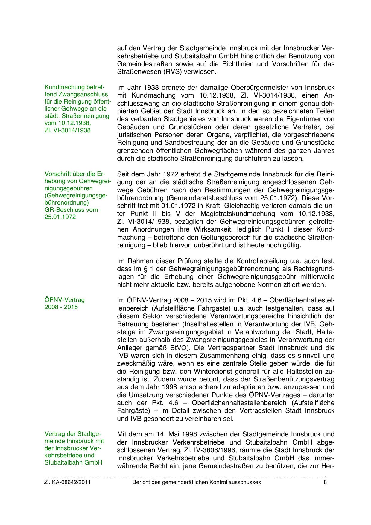 Seit dem Jahr 1972 erhebt die Stadtgemeinde Innsbruck für die Reinigung der an die städtische Straßenreinigung angeschlossenen Gehwege Gebühren nach den Bestimmungen der Gehwegreinigungsgebührenordnung (Gemeinderatsbeschluss vom 25.01.1972). Diese Vorschrift trat mit 01.01.1972 in Kraft. Gleichzeitig verloren damals die unter Punkt II bis V der Magistratskundmachung vom 10.12.1938,