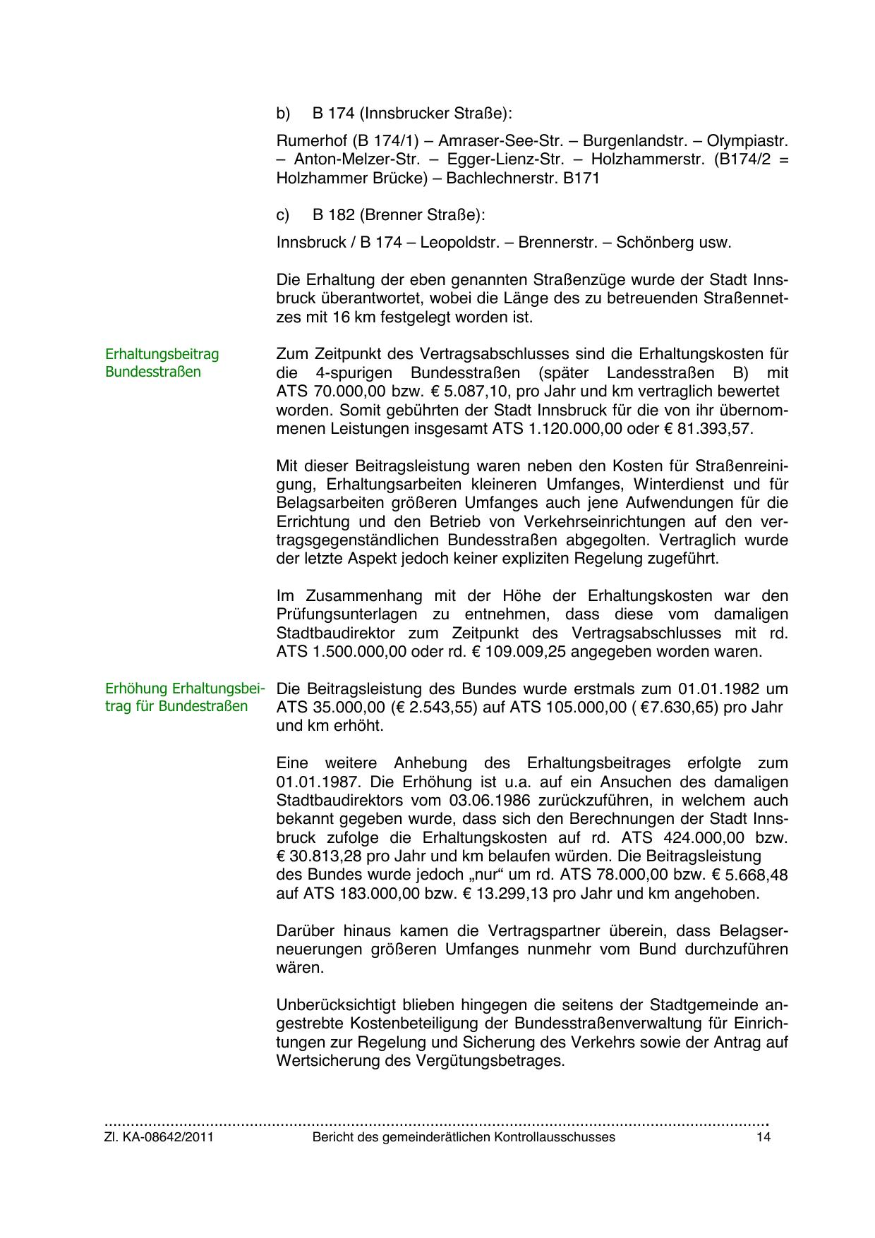 bekannt gegeben wurde, dass sich den Berechnungen der Stadt Innsbruck zufolge die Erhaltungskosten auf rd. ATS 424.000,00 bzw.
