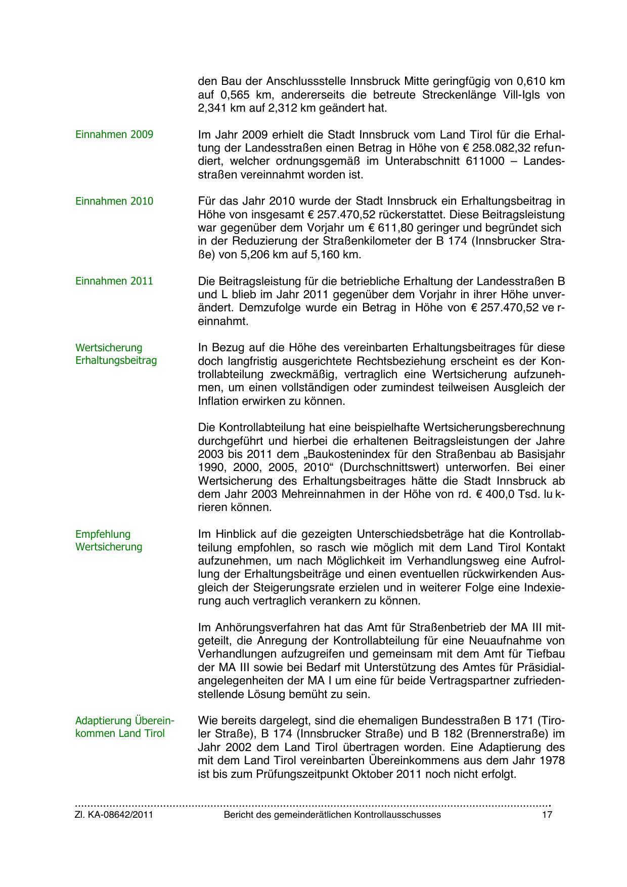 Im Jahr 2009 erhielt die Stadt Innsbruck vom Land Tirol für die Erhaltung der Landesstraßen einen Betrag in Höhe von € 258.082,32 refundiert, welcher ordnungsgemäß im Unterabschnitt 611000 – Landesstraßen vereinnahmt worden ist.
