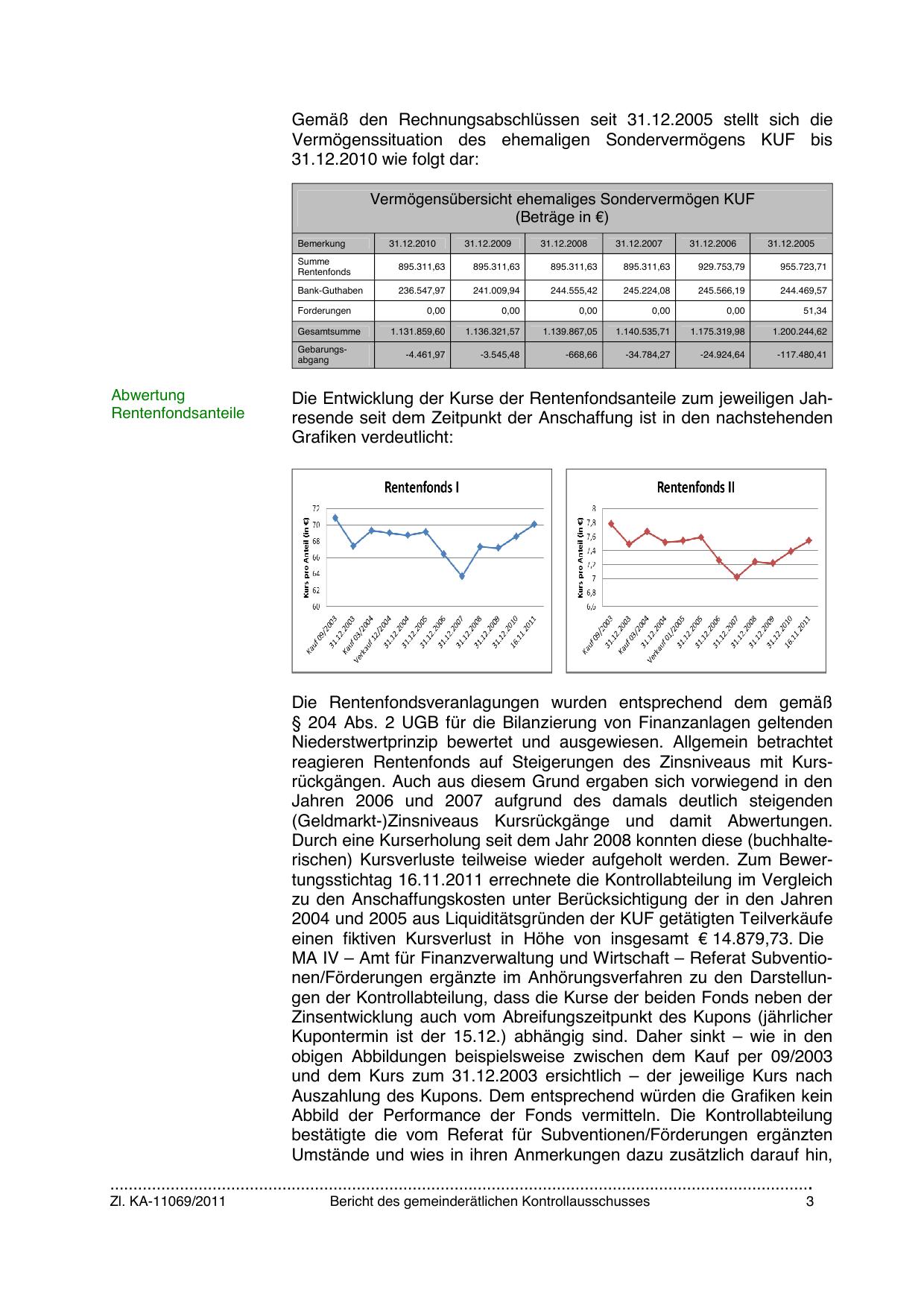 Durch eine Kurserholung seit dem Jahr 2008 konnten diese (buchhalterischen) Kursverluste teilweise wieder aufgeholt werden. Zum Bewertungsstichtag 16.11.2011 errechnete die Kontrollabteilung im Vergleich