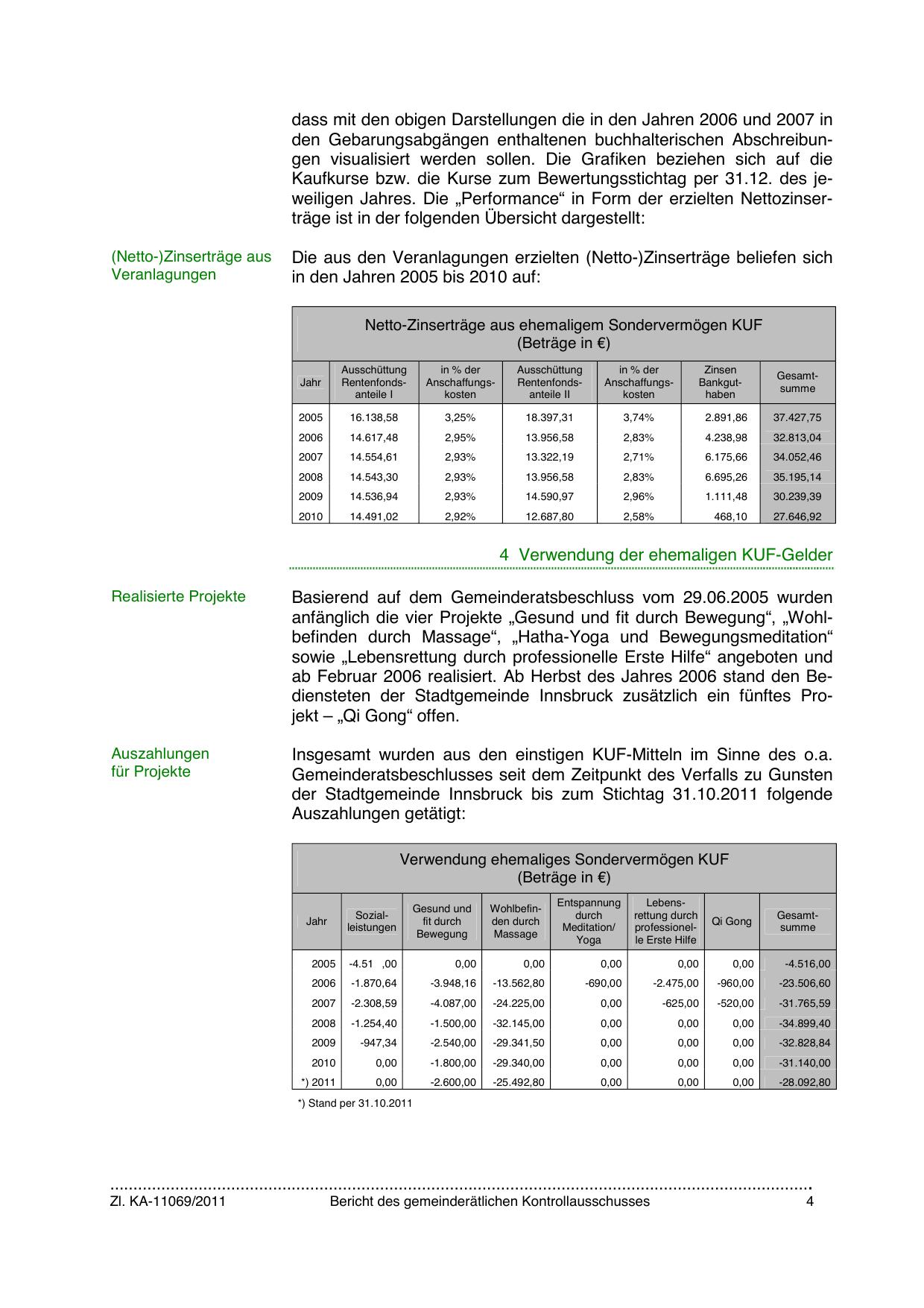 der Stadtgemeinde Innsbruck bis zum Stichtag 31.10.2011 folgende