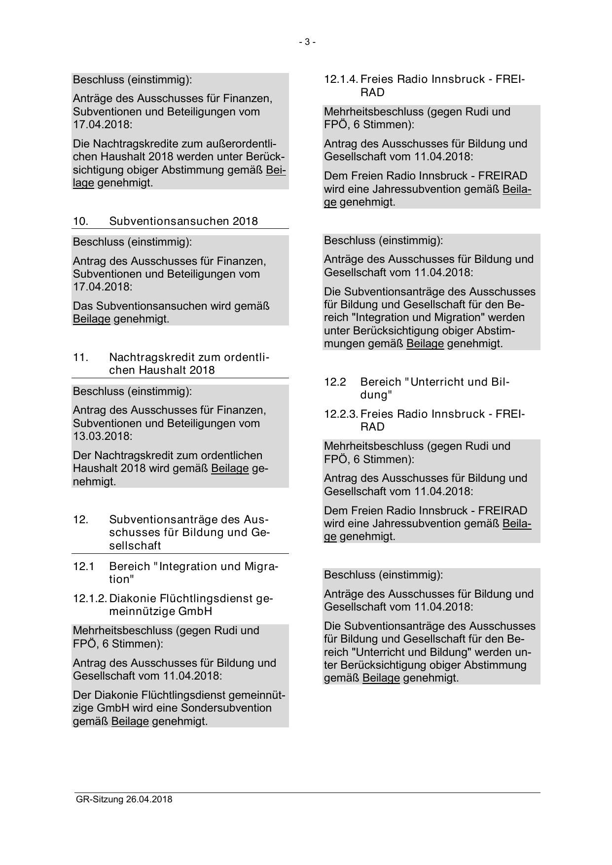 Die Nachtragskredite zum außerordentlichen Haushalt 2018 werden unter Berücksichtigung obiger Abstimmung gemäß Beilage genehmigt.