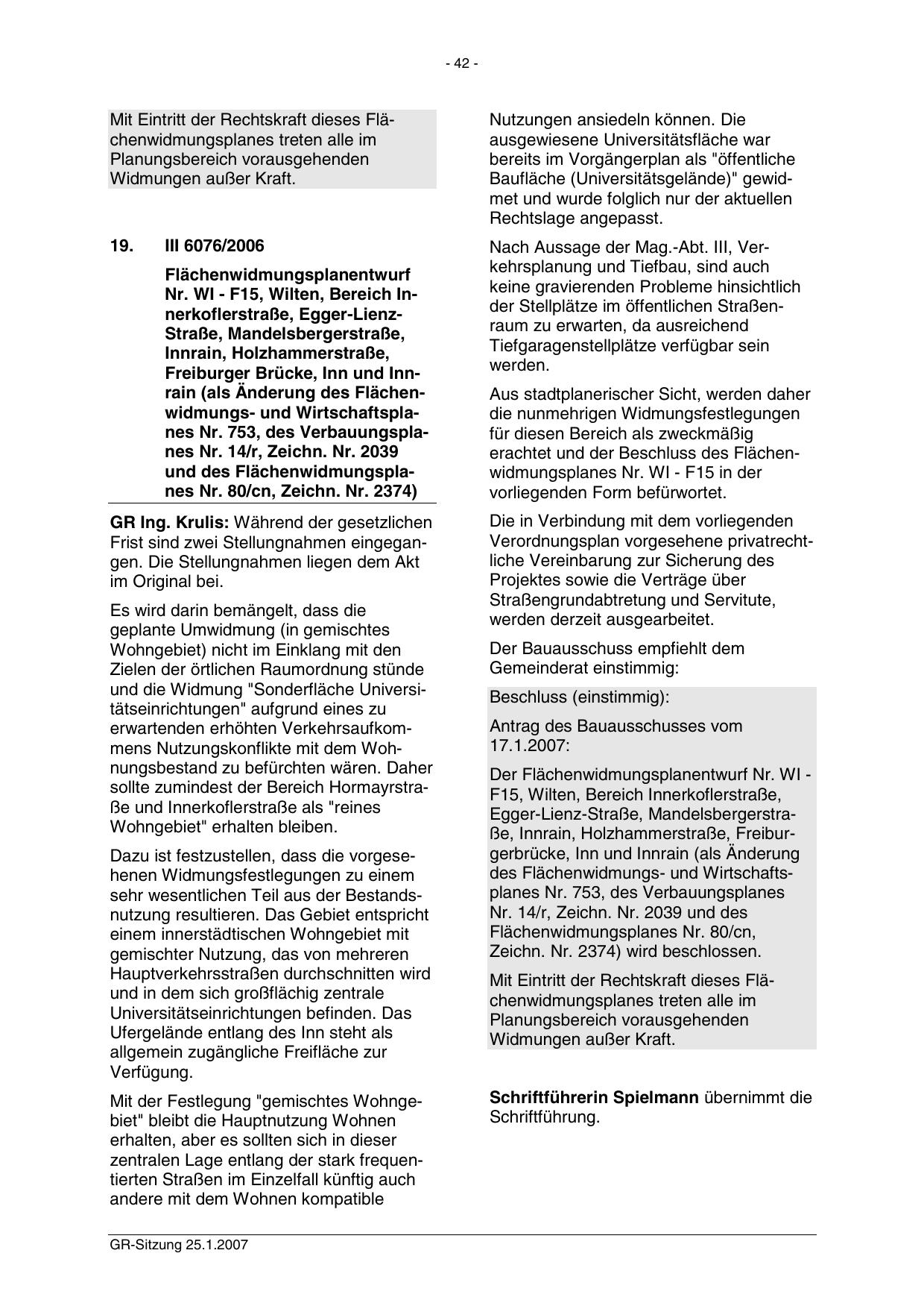 Der Flächenwidmungsplanentwurf Nr. WI F15, Wilten, Bereich Innerkoflerstraße,