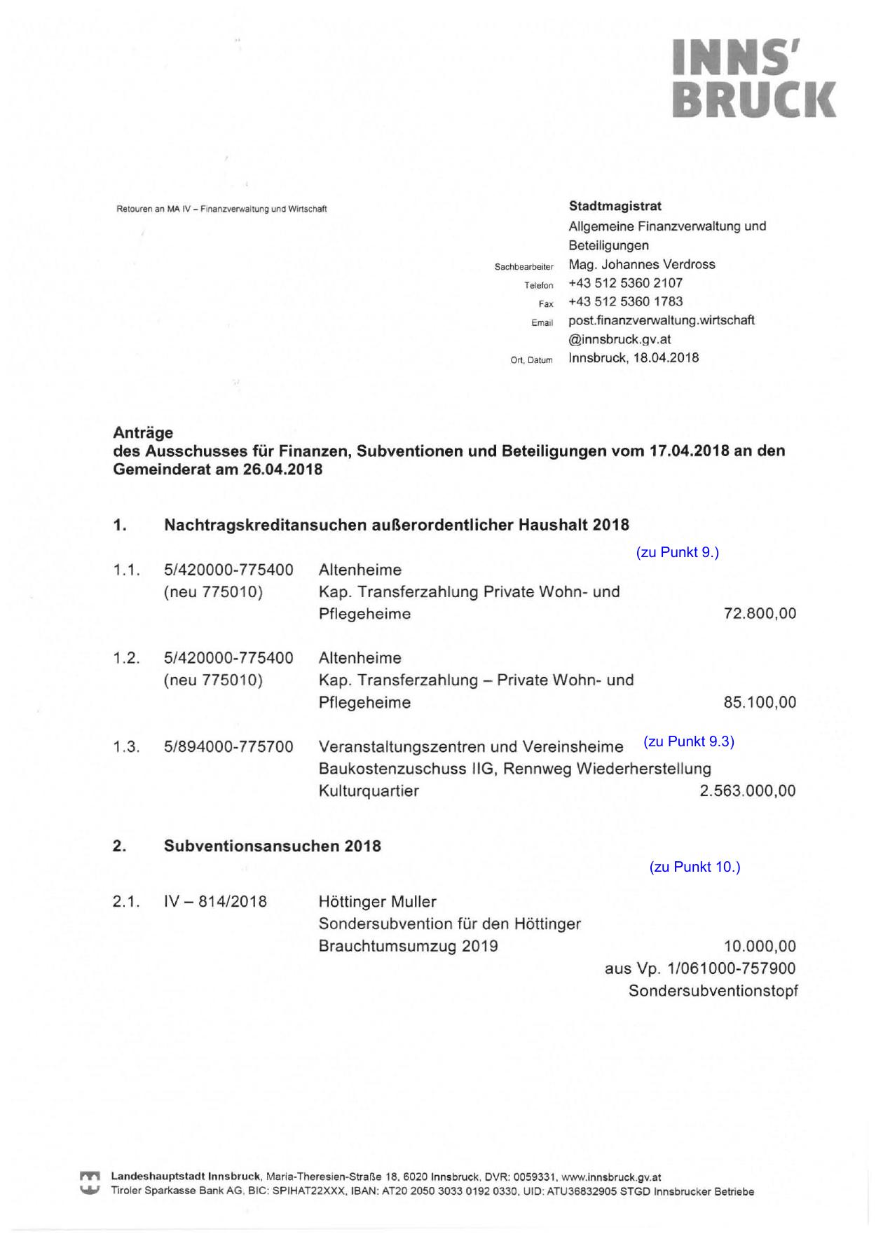 Nachtragskreditansuchen außerordentlicher Haushalt 2018