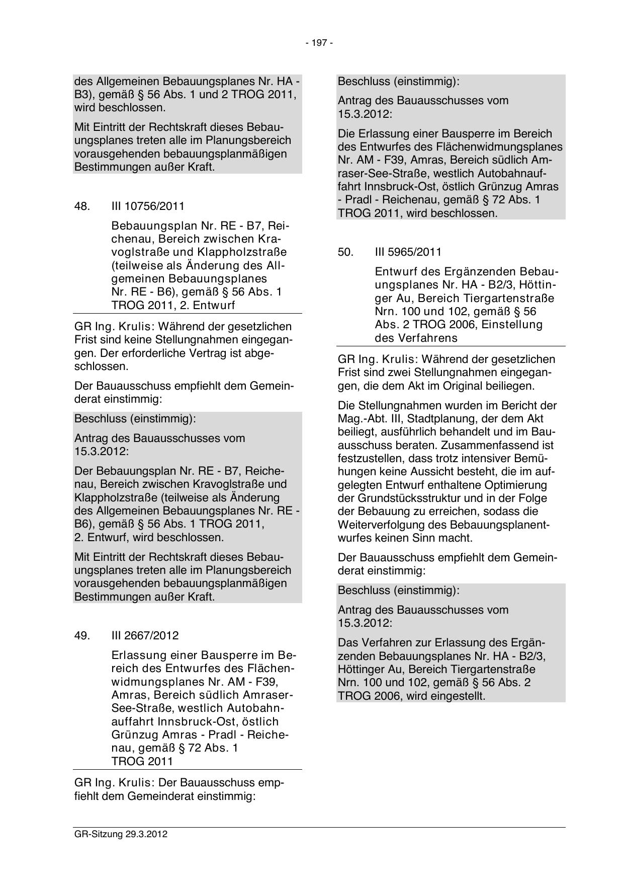 GR Ing. Krulis: Der Bauausschuss empfiehlt dem Gemeinderat einstimmig: