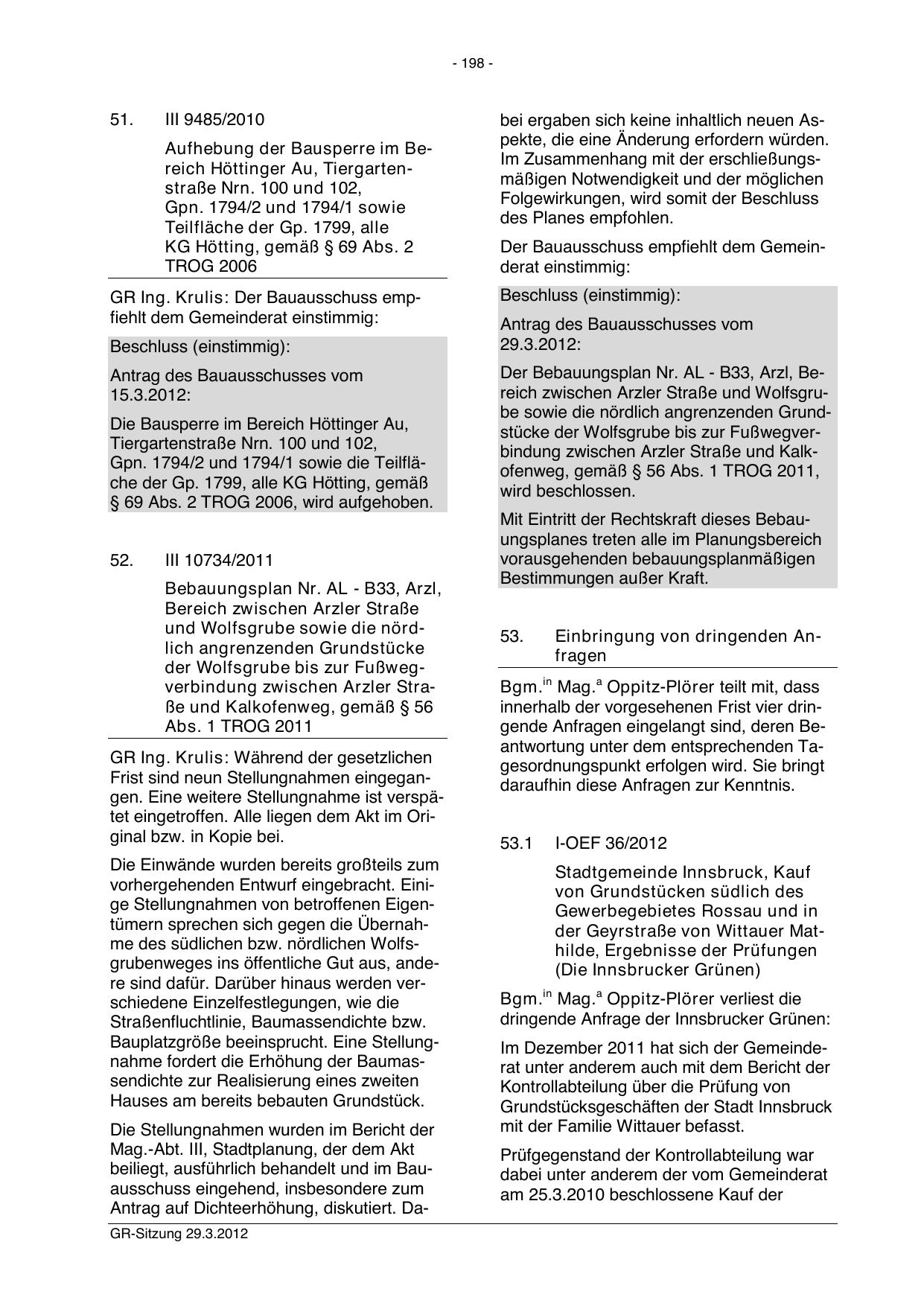 Der Bebauungsplan Nr. AL - B33, Arzl, Bereich zwischen Arzler Straße und Wolfsgrube sowie die nördlich angrenzenden Grundstücke der Wolfsgrube bis zur Fußwegverbindung zwischen Arzler Straße und Kalkofenweg, gemäß § 56 Abs. 1 TROG 2011,